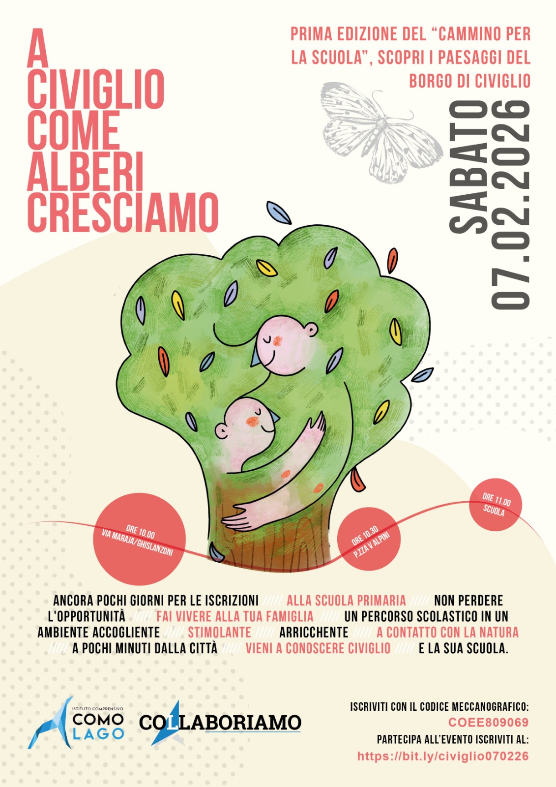 Si parte alle 10:00 dell’incrocio tra via Ghislanzoni e via Maraja dove, in questo periodo in cui sono in corso i lavori per la riapertura della strada principale, si ferma il bus che accompagna i bambini dalla Città. Di qui si raggiungerà insieme l’abitato arrivando nella piazza della frazione, dove solitamente arriva il bus numero 5, e dove c’è un parco giochi che viene spesso utilizzato come spazio aggiuntivo per la didattica; in questo luogo tranquillo i partecipanti potranno ascoltare una lettura per poi raggiungere, alle ore 11:00 la scuola che dista pochi passi. Alla scuola insegnanti e genitori accoglieranno tutti i partecipanti con momenti di approfondimento sulla didattica per le famiglie interessate e con attività dedicate ai più piccoli. La mattina poi si concluderà con una merenda/aperitivo.