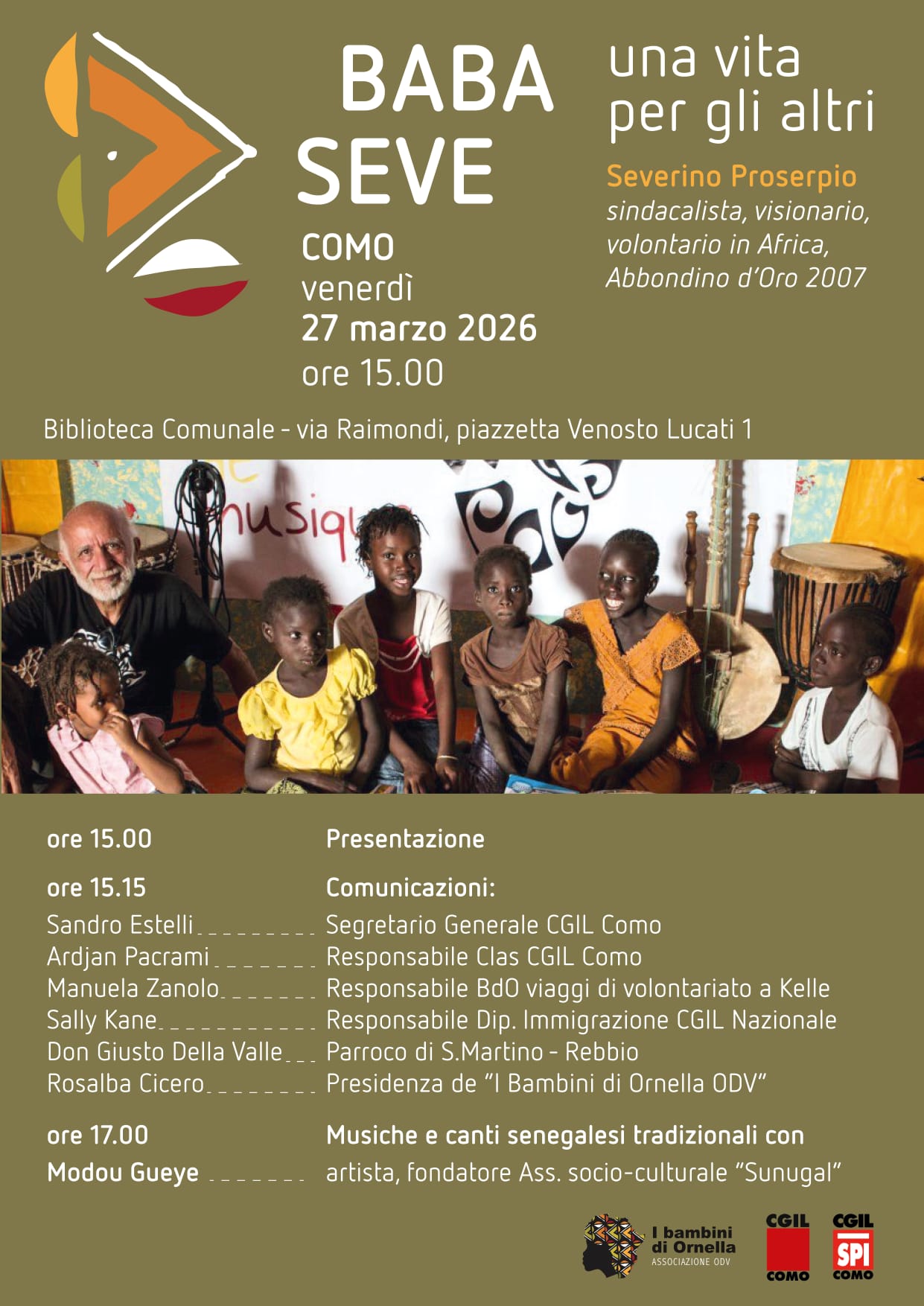 Domani, venerdì 27 marzo, alla Biblioteca di Como si svolgerà un evento dal titolo “ Baba Seve, una vita per gli altri”, dedicato a Severino Proserpio Maspes, recentemente scomparso in Senegal, già sindacalista della Cgil e poi per più di 20 anni anima fondatrice, nel villaggio costiero di Kelle, della Casa di solidarietà “Giovanni Quadroni”, centro di accoglienza per i talibeé, termine con cui vengono chiamati i bambini poveri privi di sufficiente tutela famigliare, di un’adeguata istruzione e spesso dei più elementari bisogni quali un’alimentazione sufficiente ed una minima assistenza sanitaria, indispensabili per garantir loro una crescita adeguata.
