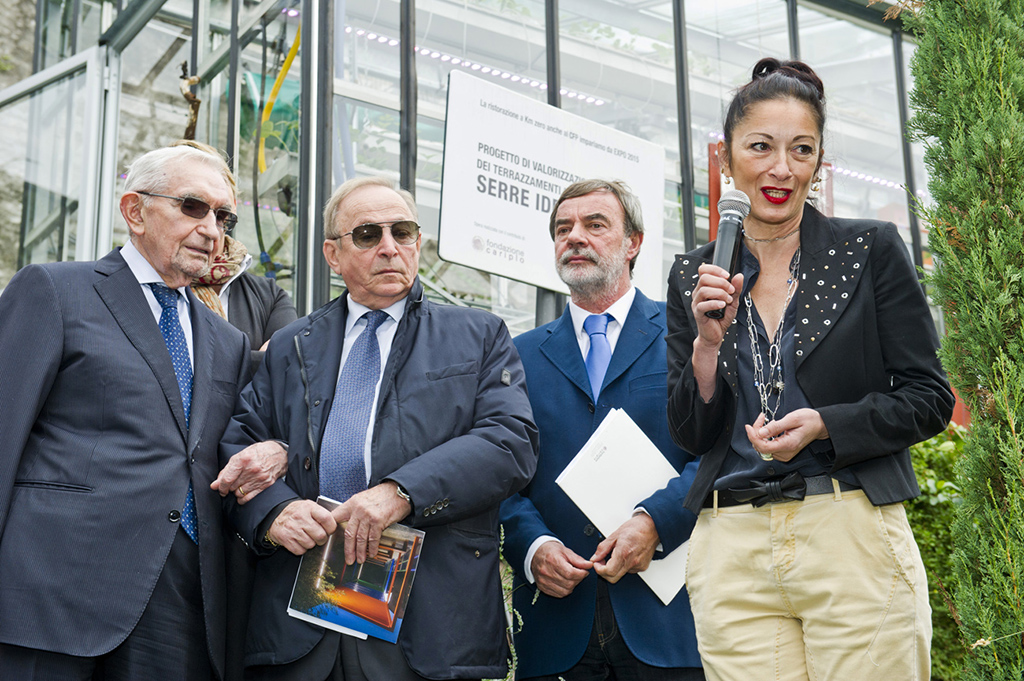 Como scuola CFP inaugurazione dello spazio di valorizzazione colturale dei terrazzamenti e sperimentazione didattico formativa, Maria Rita Livio presidente Amministrazione Provinciale, Silvio Peverelli ex direttore della scuola e Giuseppe Guzzetti presidente della Fondazione Cariplo