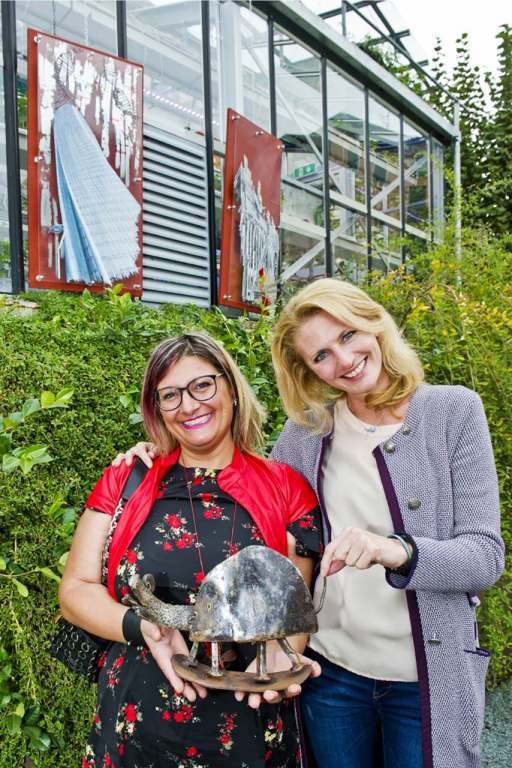 Como scuola CFP inaugurazione dello spazio di valorizzazione colturale dei terrazzamenti e sperimentazione didattico formativa, le artiste Guendalina Testoni con una delle sue sculture esposte e Marika Pozzi con sullo sfondo i suoi quadri