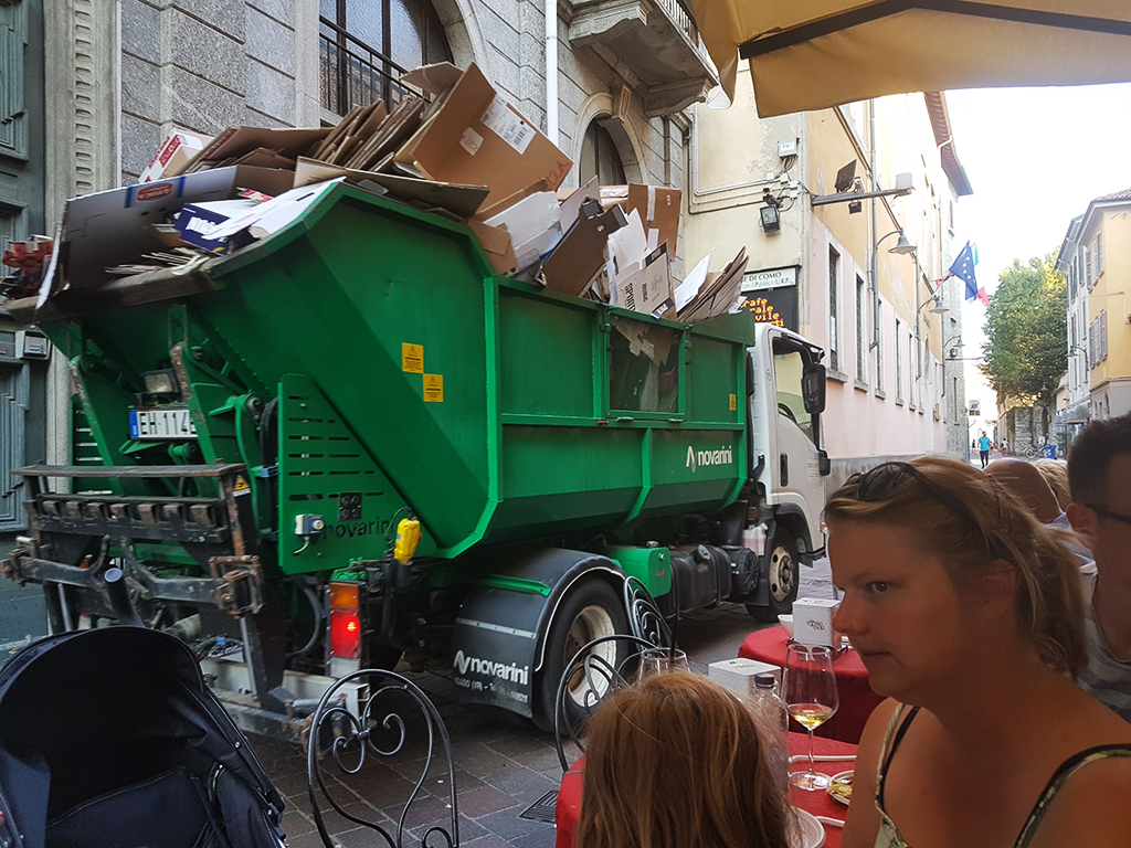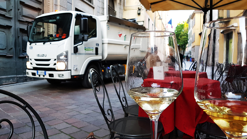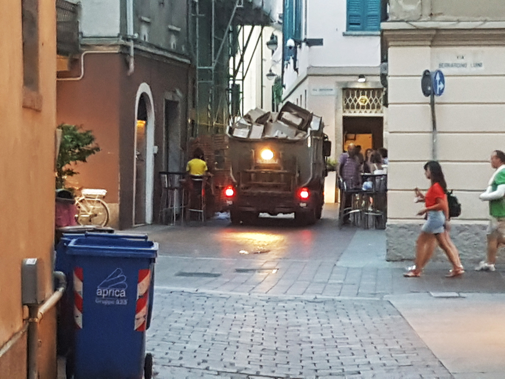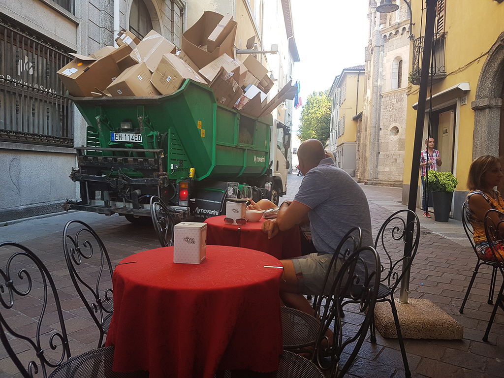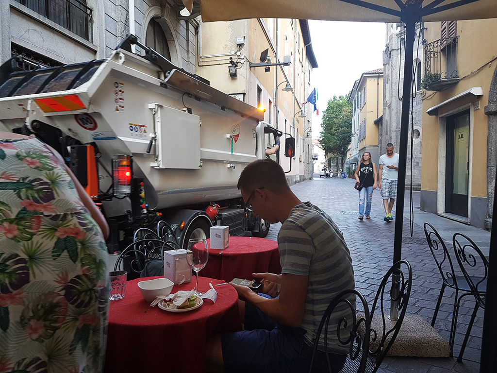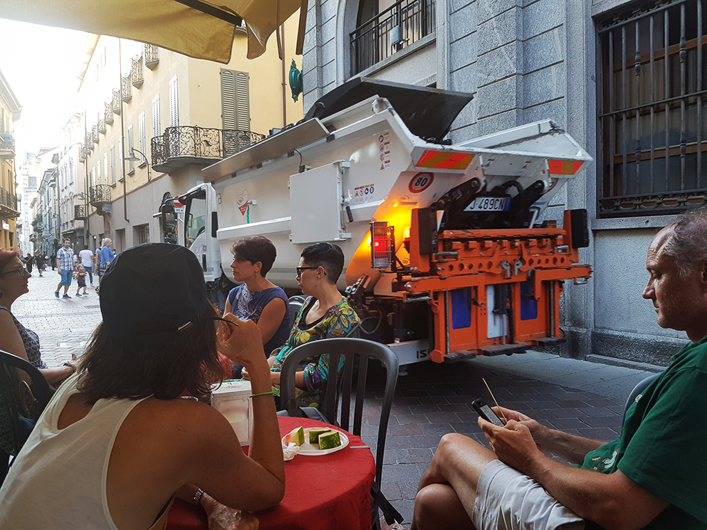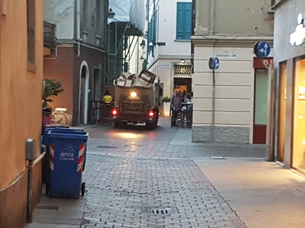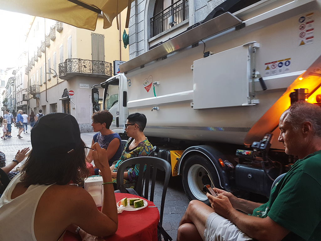 Tra le 19.10 e le 20.43 (almeno) tavolini e camion di Aprica (gestore della raccolta rifiuti) hanno duettato vicini-vicini, esattamente come accadeva fino al mese scorso.