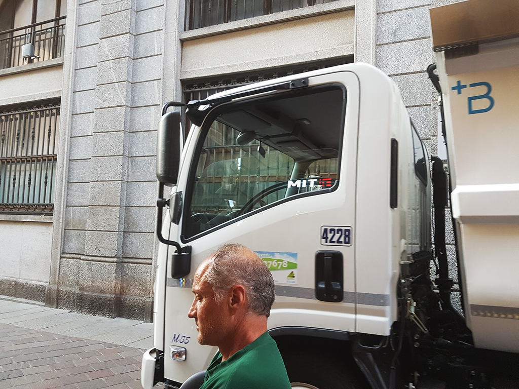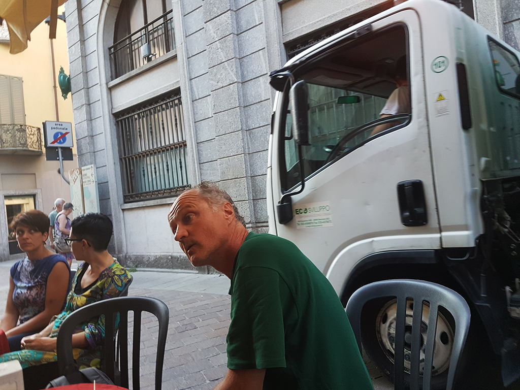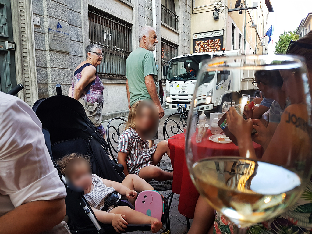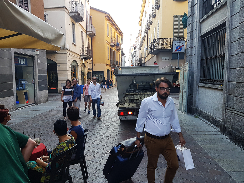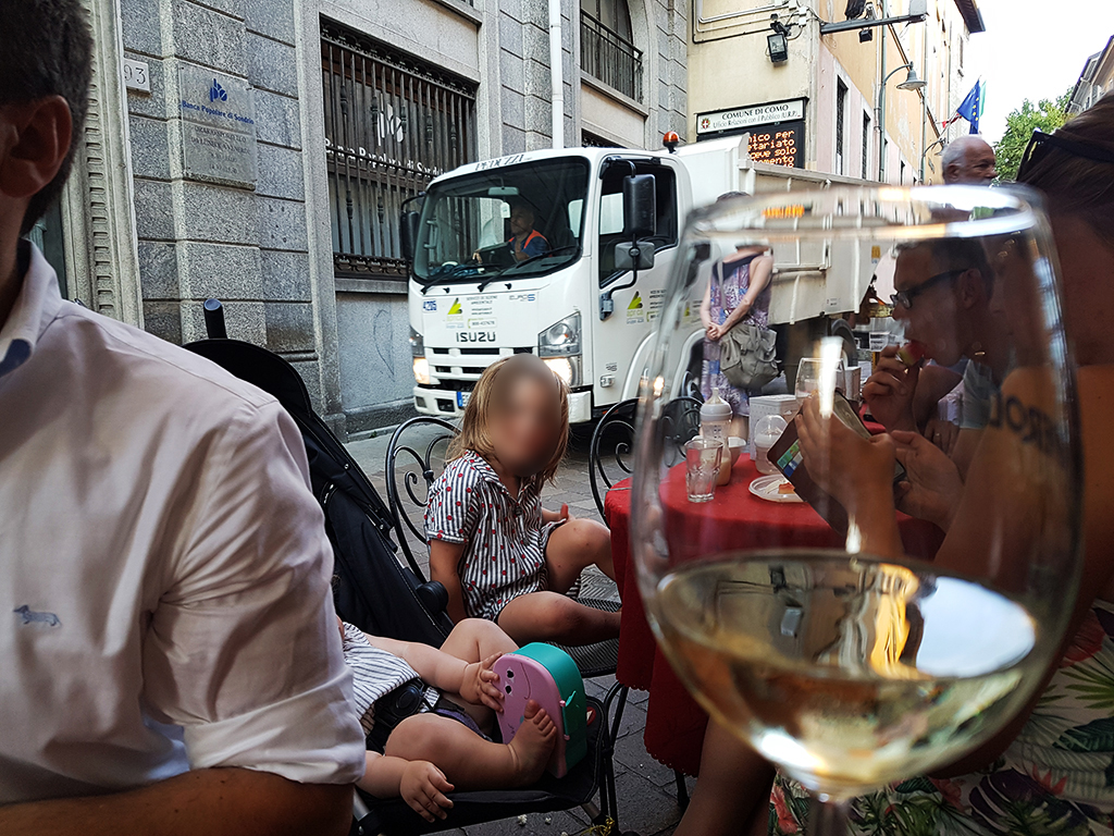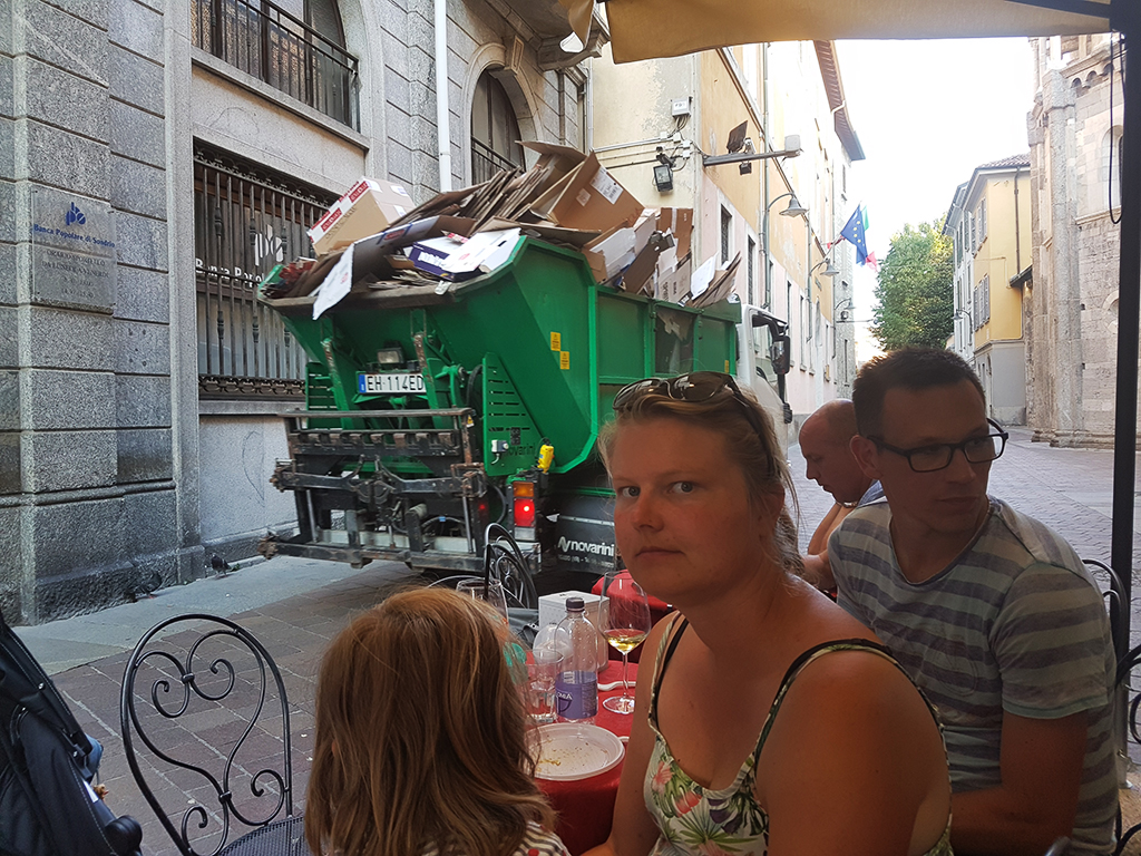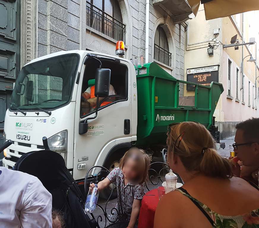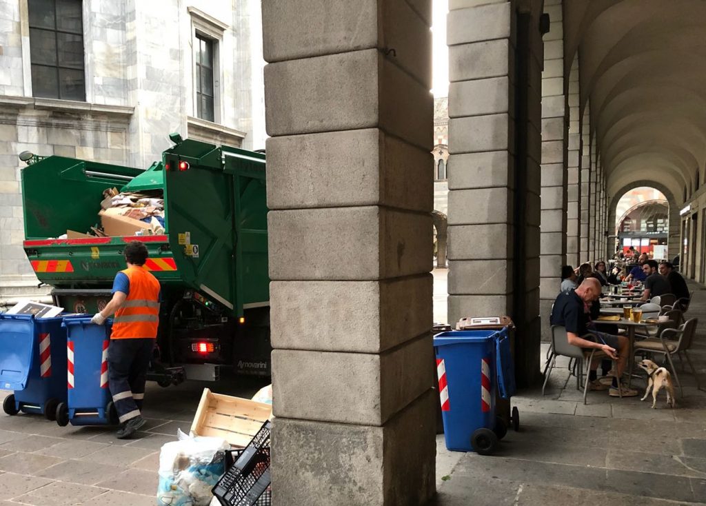 Tra le 19.10 e le 20.43 (almeno) tavolini e camion di Aprica (gestore della raccolta rifiuti) hanno duettato vicini-vicini, esattamente come accadeva fino al mese scorso.