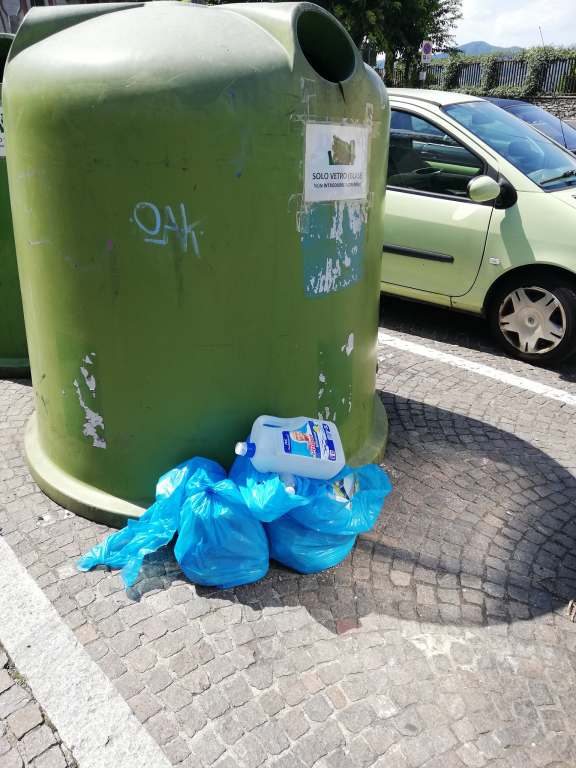 Come dicevamo, elettrodomestici abbandonati, rifiuti domestici nei cestini per strada e sacchi blu chiaramente fuori posto ai piedi di una campana del vetro.
