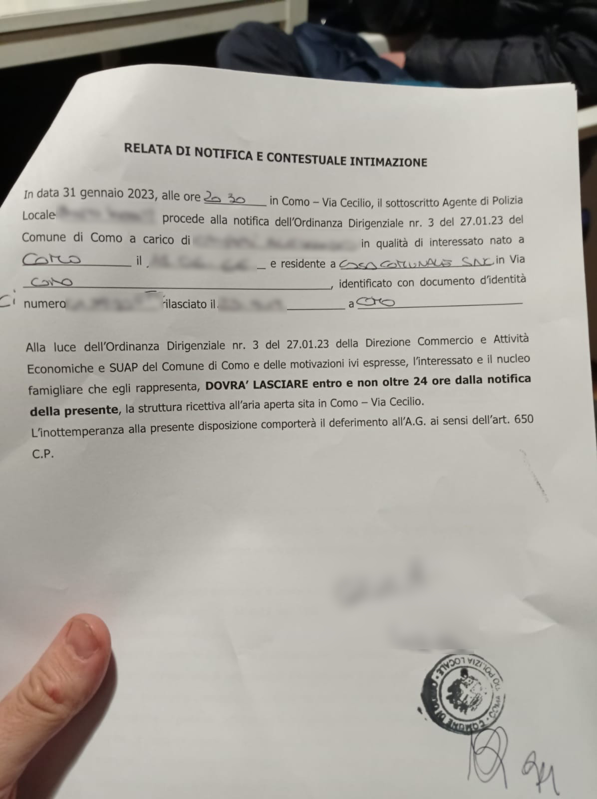 Nel Divieto di prosecuzione attività si legge (documento integrale sotto) come “In data 31 gennaio 2023, alle ore 20.30 in Como, via Cecilio [… ] alla luce dell’Ordinanza Dirigenziale n° 3 del 27.01.23 […] l’interessato e il nucleo famigliare che egli rappresenta, DOVRA’ LASCIARE entro e non oltre 24 ore dalla notifica della presente, la struttura ricettiva all’aria aperta sita in Como – via Cecilio. L’inottemperanza alla presente disposizione comporterà il deferimento all’Autorità Giudiziaria“, etcetera.