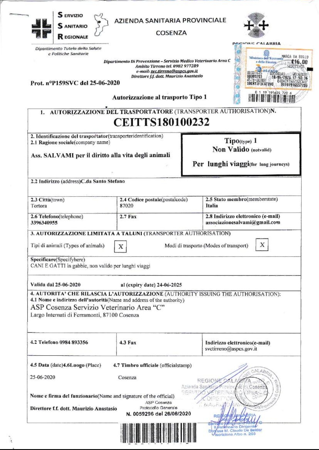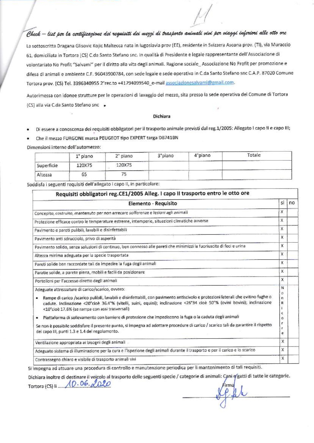 “E’ tutto documentato, non abbiamo nulla da nascondere e abbiamo già incaricato il nostro legale di valutare se ci sono gli estremi per una querela nei – ci ha spiegato la presidente della Onlus – il furgone è a norma, abbiamo tutti i documenti che lo dimostrano (che abbiamo ricevuto e che vi mostriamo sotto, Ndr) e il viaggio prevede una tappa per far dormire i volontari e far uscire i cani dai box. Per quanto riguarda invece l’auto è vero, non sapevamo che, avendo targa svizzera, non potesse essere guidata da un residente in Italia e non contesto la multa ma non è assolutamente vero che i cani fossero stipati in due box e non potessero essere trasportati su questo mezzo. Si trattava di sette cagnolini di taglia piccola in tre box e tutti con microchip intestato a mio marito. Da quando esiste una legge che vieta a un privato di trasportare i propri cani su un’auto? Inoltre sono stata obbligata a pagare la multa al momento e in contanti, non con la carta di credito, per evitare il sequestro dell’auto. Si tratta di più di 1300 euro, ho dovuto fare una colletta tra i presenti. E’ così che funziona?”.
