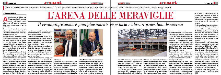 Decisamente soddisfatto anche il presidente di Cantù Arena, Antonio Munafò. “Siamo felici per come stanno procedendo i lavori e fiduciosi per la loro conclusione. Ciò che inoltre mi riempie di orgoglio è vedere come tutti i soggetti coinvolti lavorino e collaborino tra di loro, si interfacciano con le istituzioni e le banche in un gioco di squadra. Dimostrazione che il territorio si è reso conto e sente questo progetto come un qualcosa di veramente importante”.