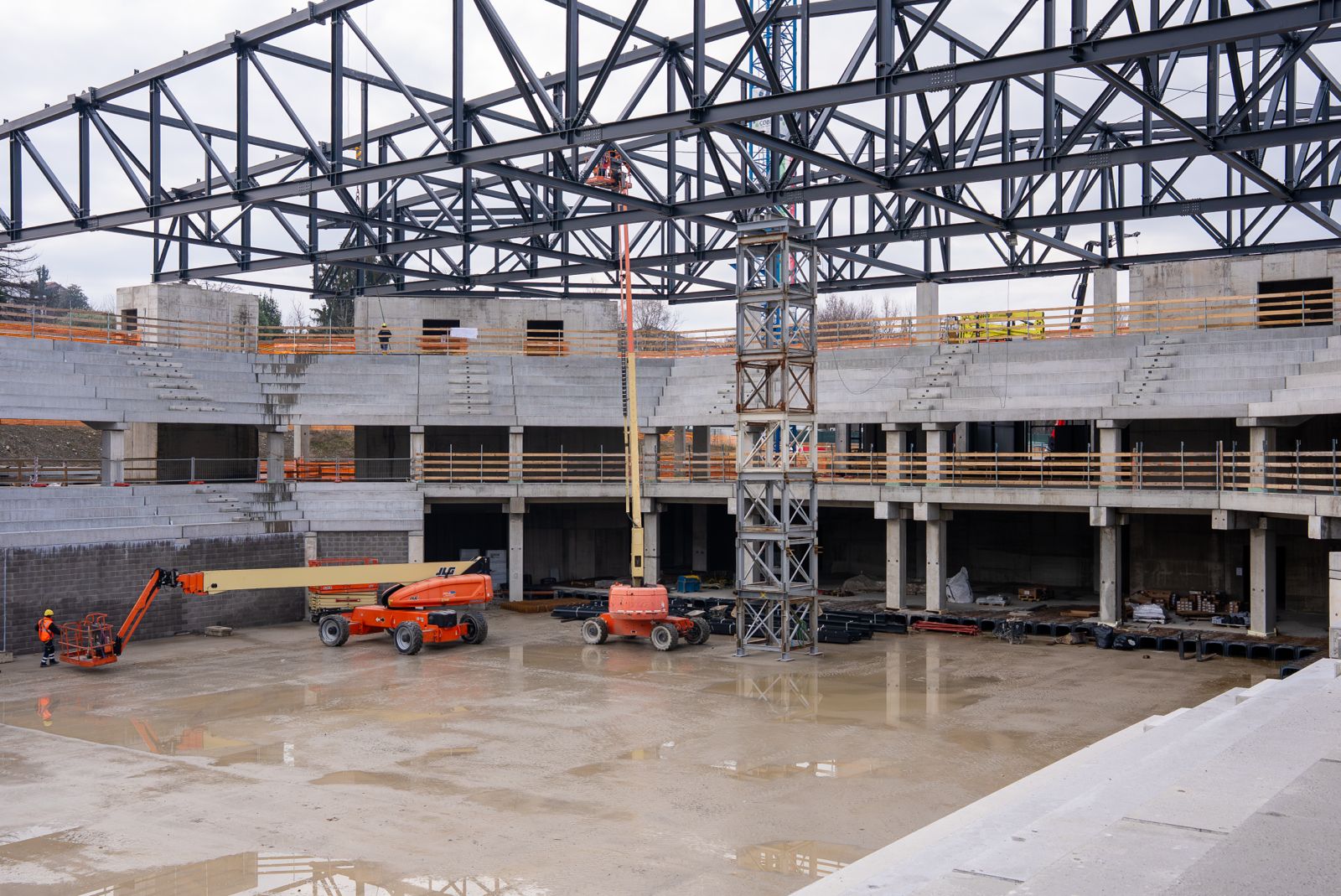 In corso di lavorazione, inoltre le gradinate dell’arena principale. Contemporaneamente alla copertura della palestra secondaria, si sta lavorando anche alla copertura dell’arena principale.