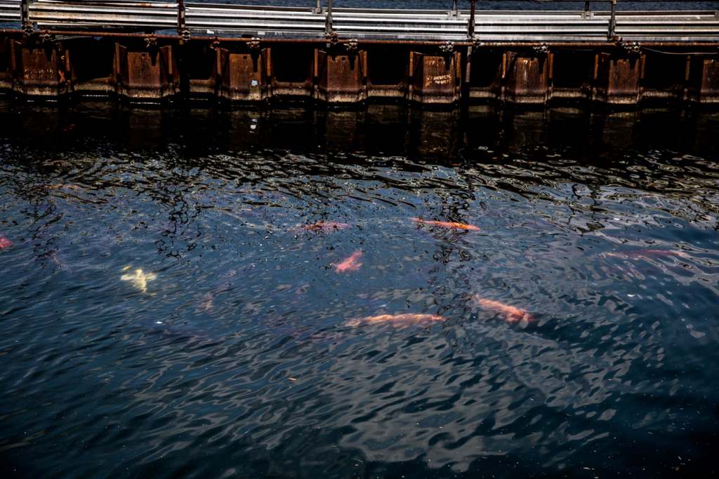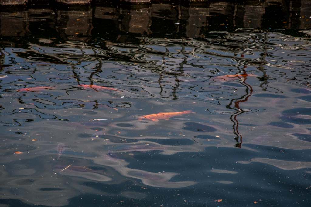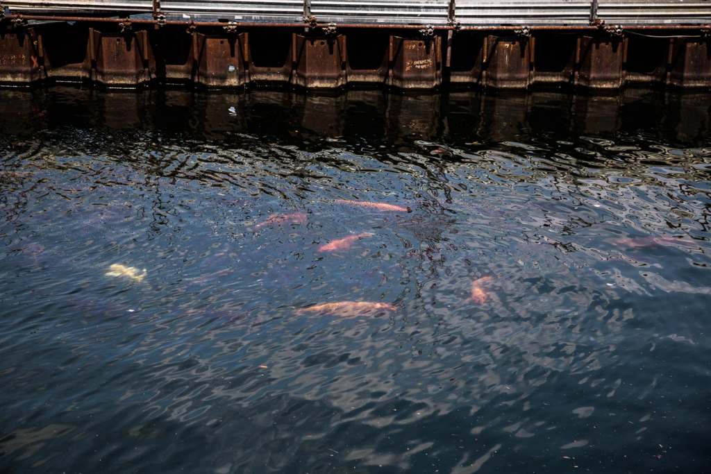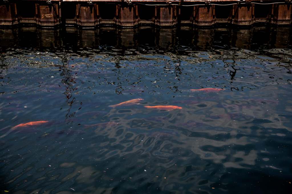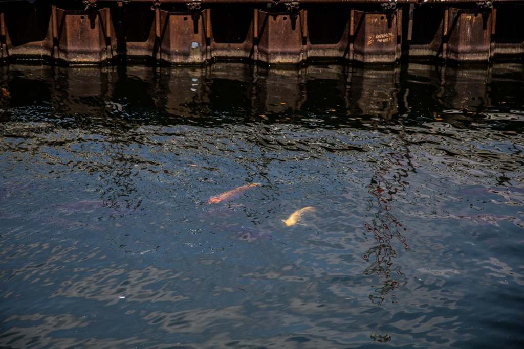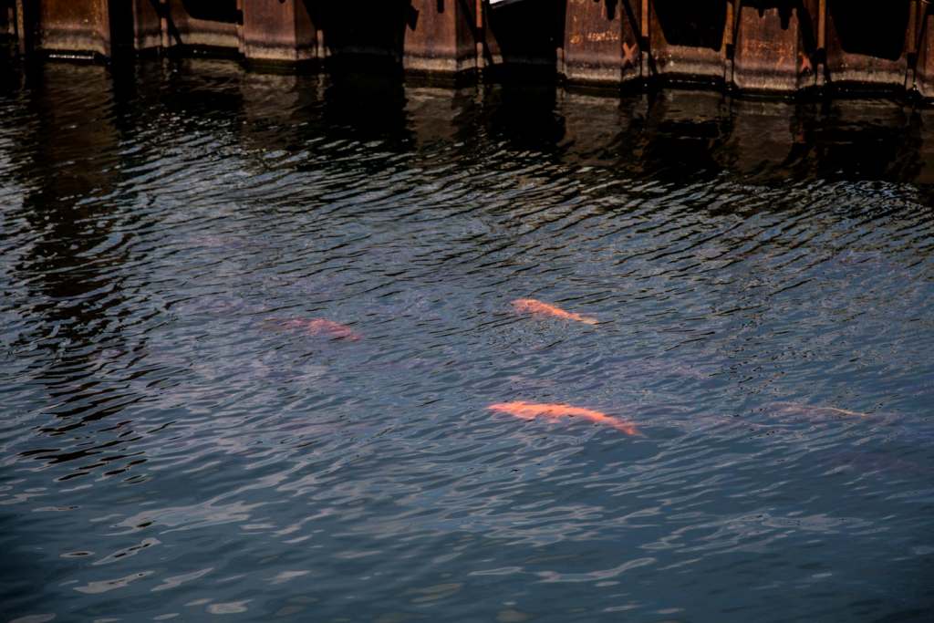 Non se grassi e arancioni, però, come le decine di carpe koi che si possono ammirare in questi giorni nuotare sotto sponda, lungo la riva, al riparo delle palancole della paratie, al fianco delle nostrane carpe nere