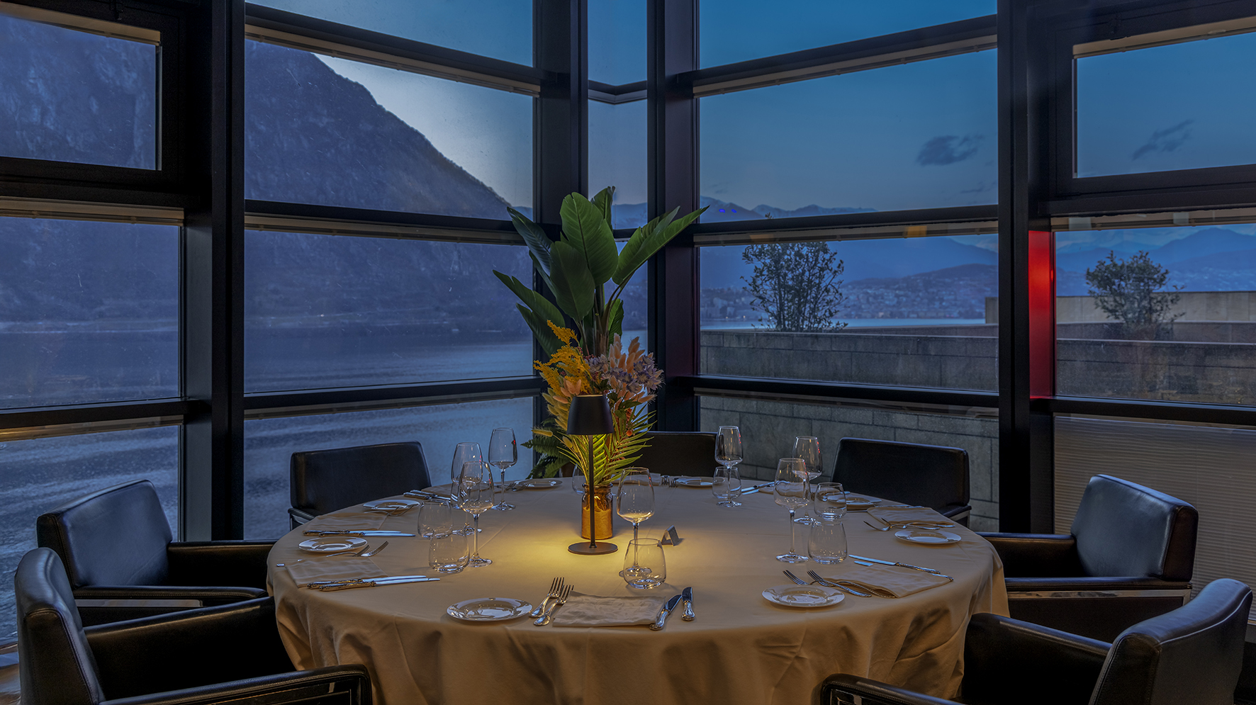 Il Salone delle Feste sorge all’interno dell’iconico edificio progettato dall’architetto Mario Botta. Situato al settimo piano, il Ristorante Riviera offre una vista panoramica a 180° sul Lago di Lugano, godibile anche dalle ampie terrazze esterne. Il ristorante accoglie il pubblico ogni giorno dalle 19.00 alle 22.30 (fino alle 23.00 nel weekend) ed è disponibile per eventi privati.