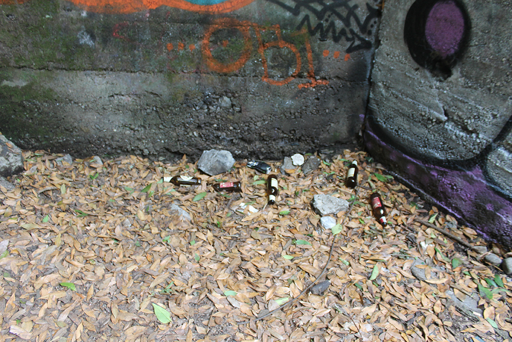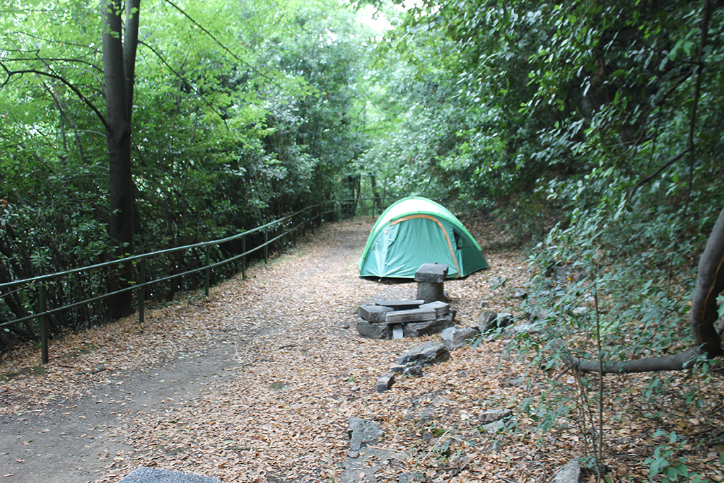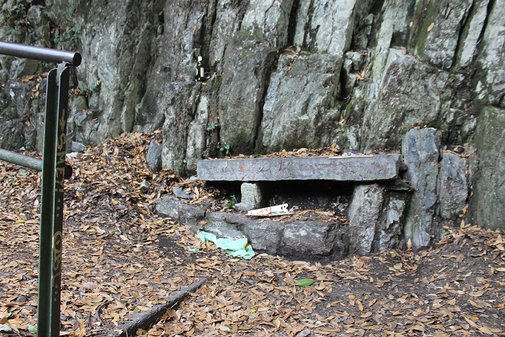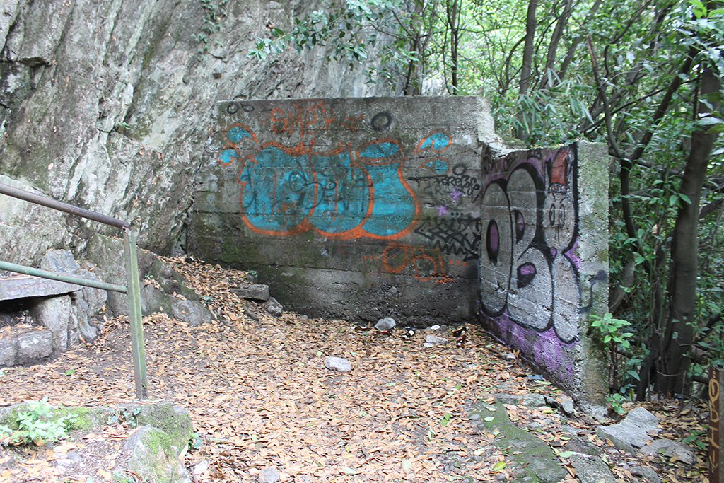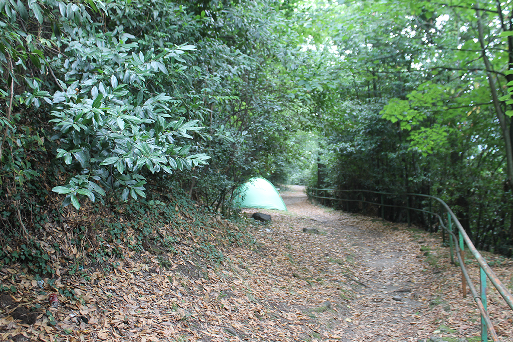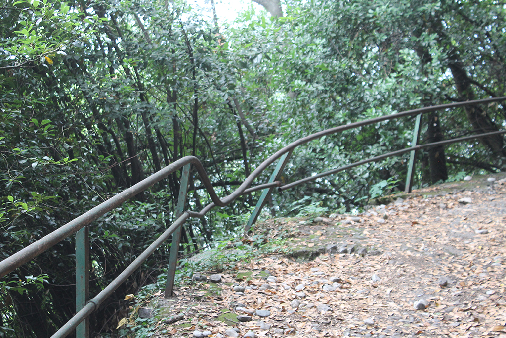 Le foto parlano chiaro: acciottolato pieno di buche, panorama nascosto da una giungla effettiva, balaustre arrugginite e pericolosamente rotte, bottiglie di birra abbandonate, scritte sui muri, una piccola discarica nascente sotto il sentiero, un falò costruito con i resti di una panchina di granito rotta e persino una tenda che qualcuno (turista in economia o senzatetto? Pare sia qui da molto tempo) ha deciso di piantare qui, che fa fresco e tanto non passa nessuno (sotto la gallery completa, a testimonianza).