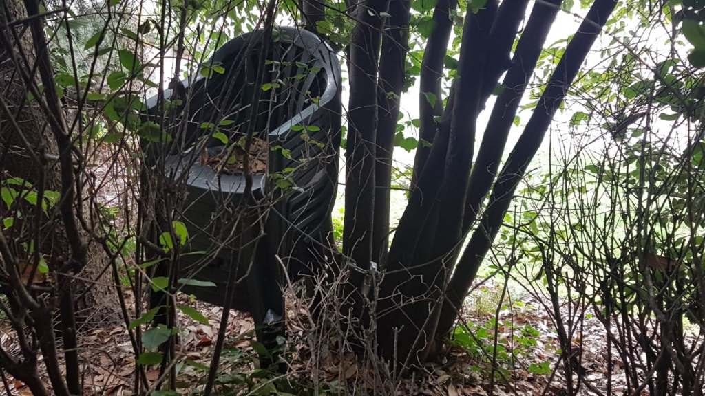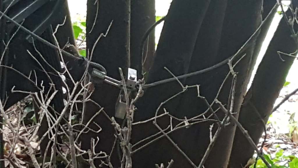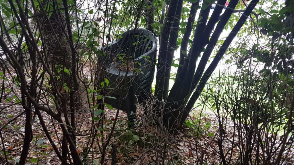 E una pila di sedie di plastica legate con un lucchetto a un albero, chissà perché e chissà da chi.