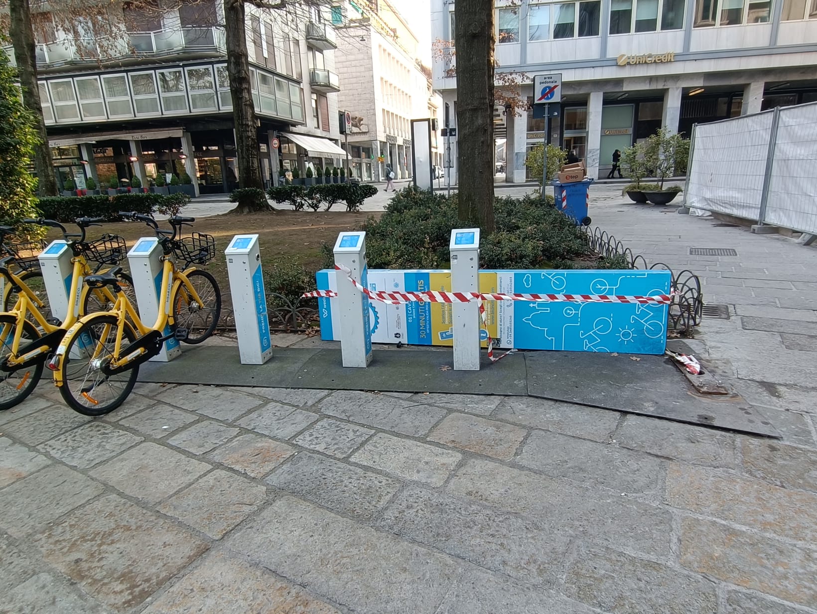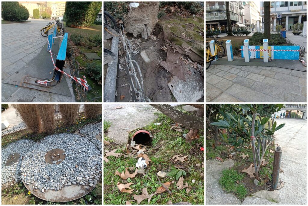 “Ad esempio – scrive Bottone – piazza Cavour è diventata solo una distesa di cemento e basta (se non occupata per qualche evento sporadico). La piazza principale di Como che si affaccia sul lago si presenta al degrado più assoluto tra topi morti, panchine spaccate, fontane non funzionanti e abbandonate, recinzioni rotte, stalli bici distrutti, cabine dell elettricità abbattute e così via”.