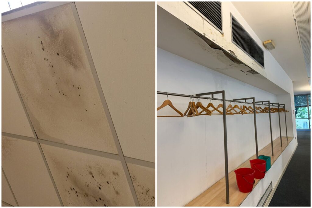 A causa di copiose infiltrazioni d’acqua per le forti piogge si è reso necessario posizionare secchi nella zona degli appendiabiti. Segni evidenti anche sul soffitto, danneggiato.