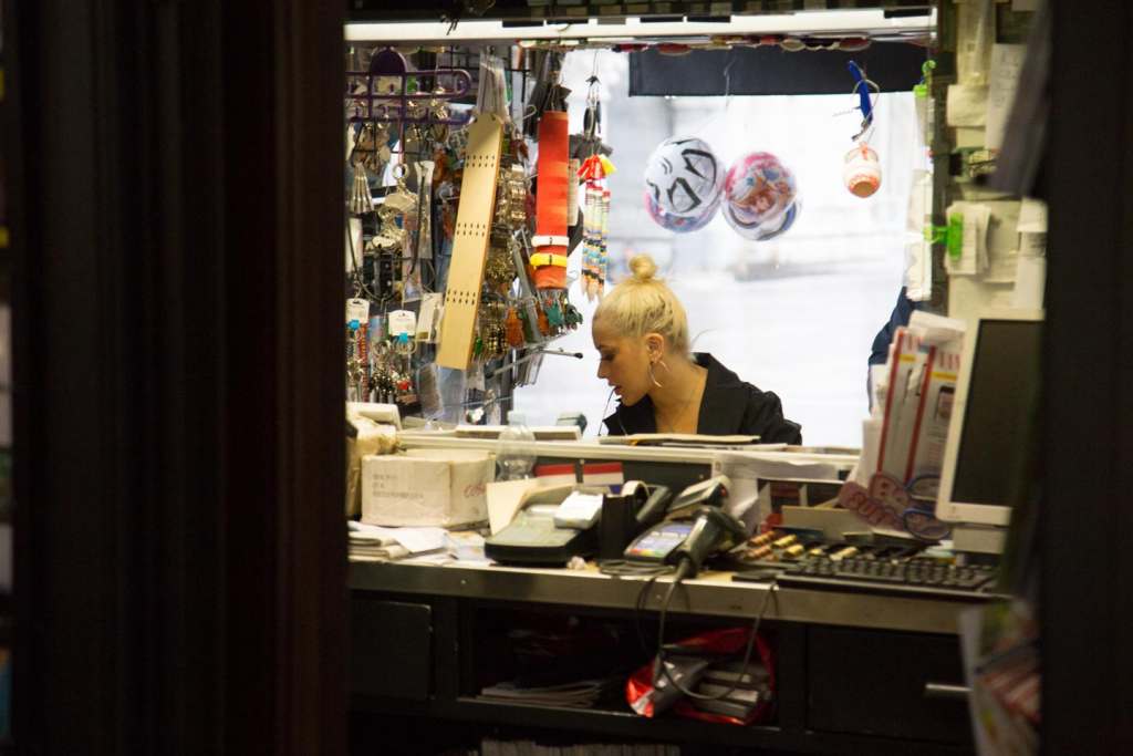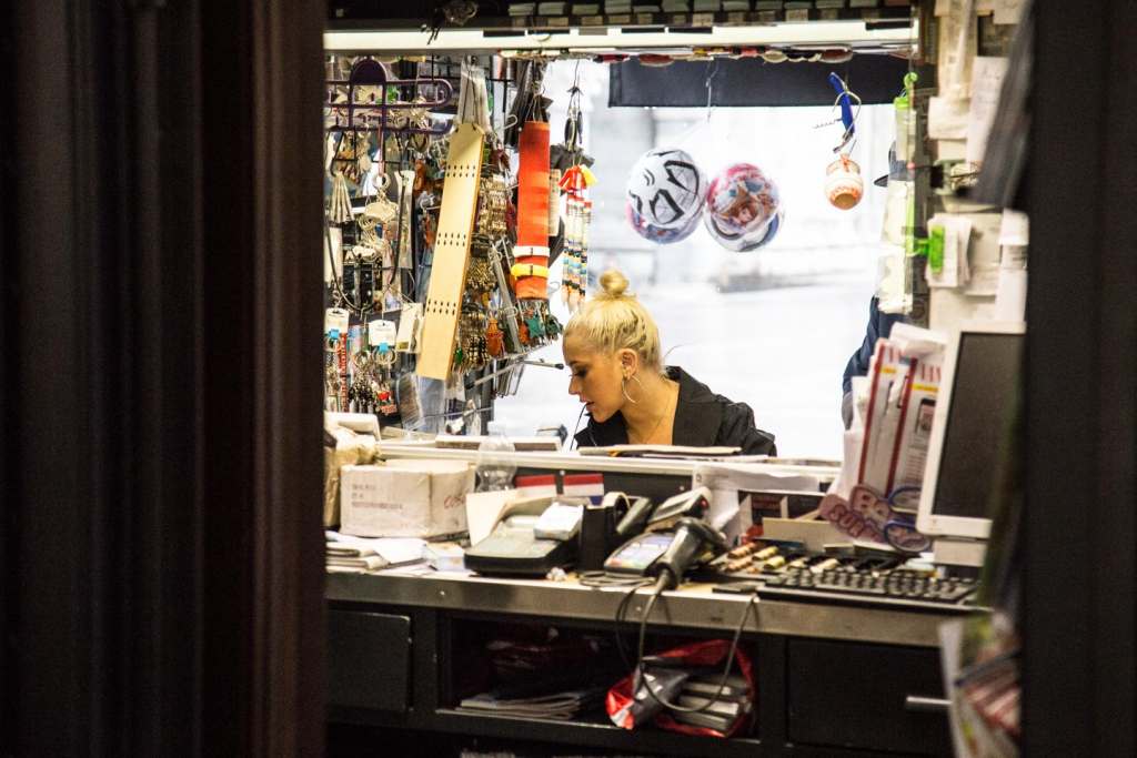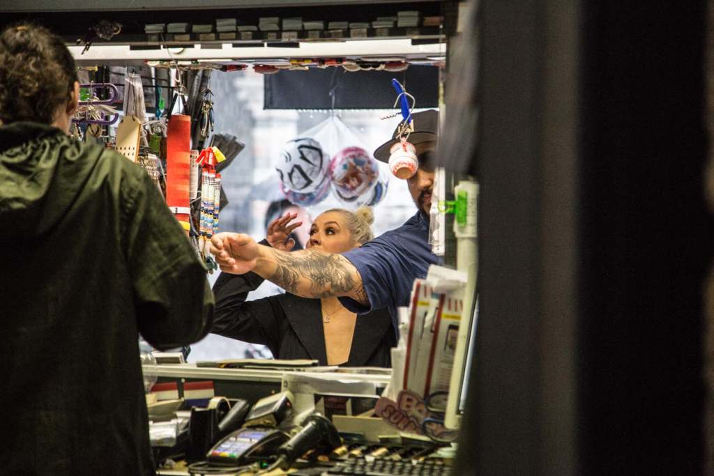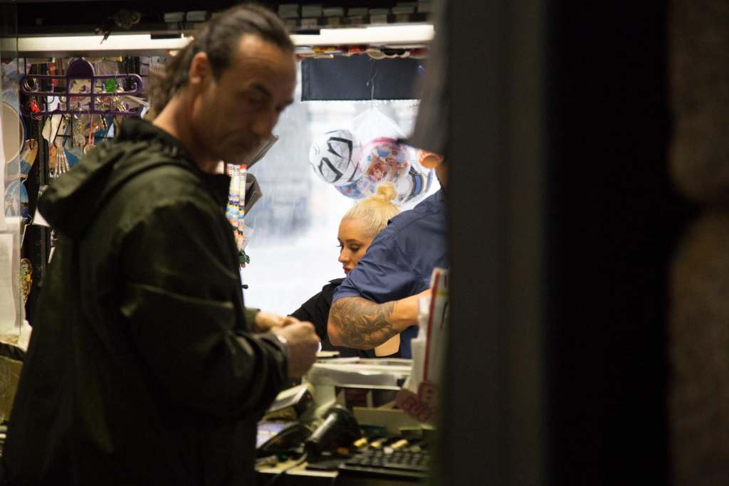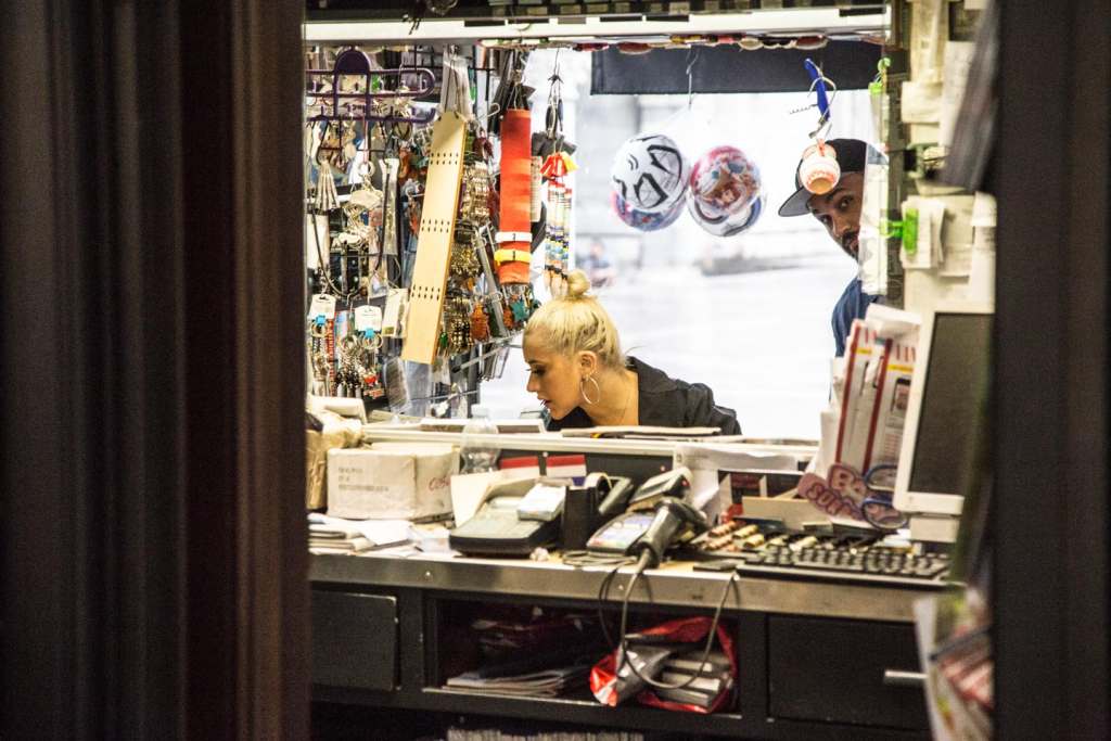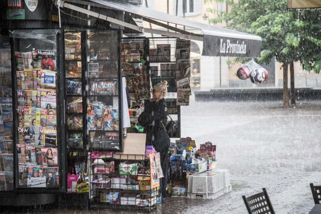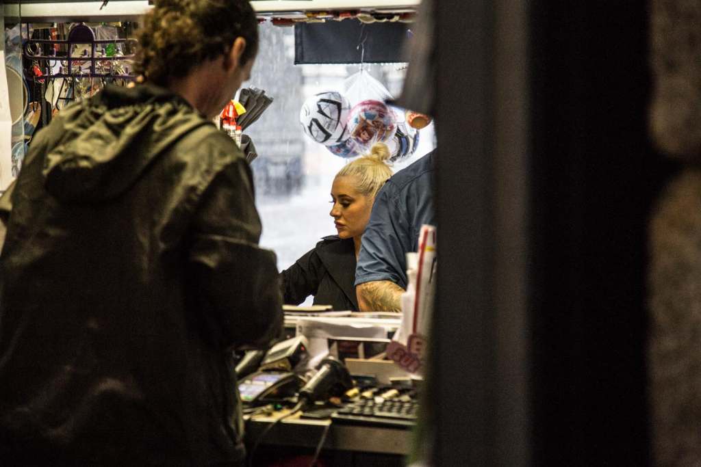 Circondata dal proprio entourage, la Aguilera si è fermata a fare acquisti all’edicola della piazza, sotto un potente acquazzone.
