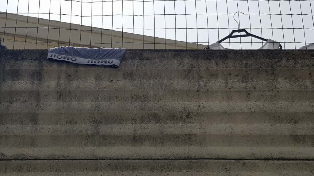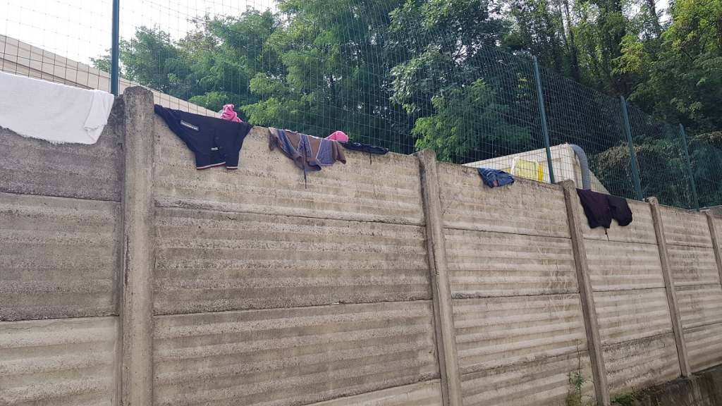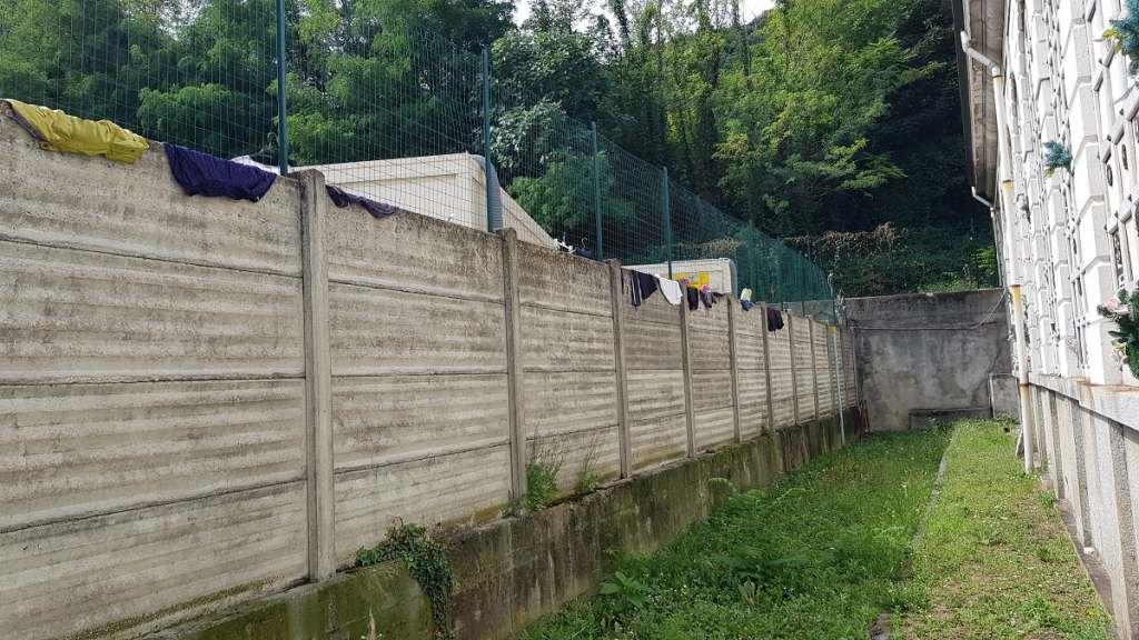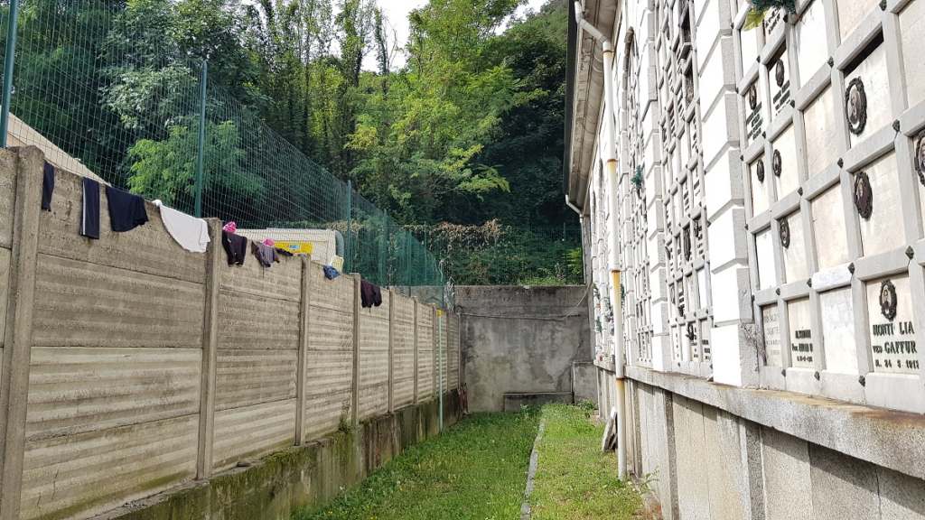 Dall’altro capo della vegetazione selvaggia, ecco il muro di cinta del centro migranti. Una sorta di maxi-stendino, di fatto, che – senza voler colpevolizzare i richiedenti asilo, certamente in gran parte inconsapevoli di avere il principale cimitero cittadino alle proprie spalle – offre una vasta esposizione di mutande, magliette, felpe e jeans con vista sui cari estinti. Quello, infatti, vedono i cari estinti dalle loro foto ovali e seppiate, due metri più in là.