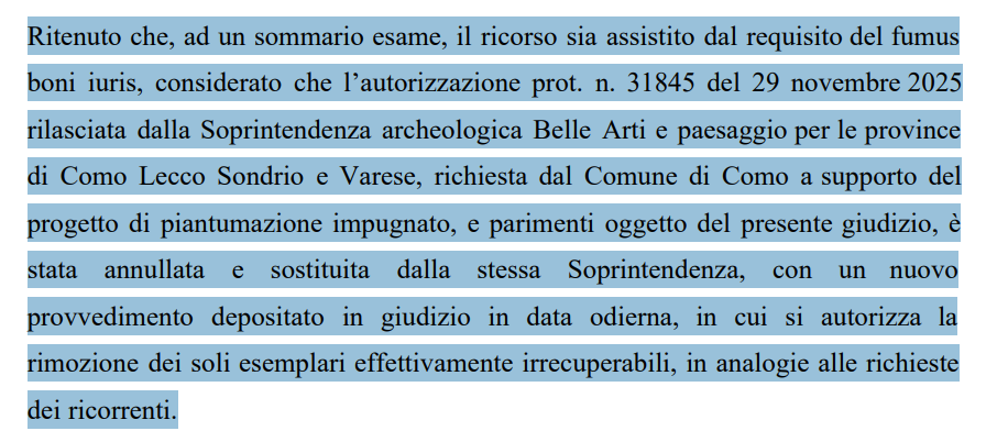 A pesare sulla decisione ovviamente la presa di posizione della Sovrintendenza, scrivono i giudici amministrativi: “Ritenuto che, ad un sommario esame, il ricorso sia assistito dal requisito del fumus boni iuris )parvenza, verosimiglianza o probabilità dell’esistenza del diritto vantato da una parte in un processo, fondamentale per ottenere provvedimenti cautelari, Ndr), considerato che l’autorizzazione prot. n. 31845 del 29 novembre 2025 rilasciata dalla Soprintendenza archeologica Belle Arti e paesaggio per le province di Como Lecco Sondrio e Varese, richiesta dal Comune di Como a supporto del progetto di piantumazione impugnato, e parimenti oggetto del presente giudizio, è stata annullata e sostituita dalla stessa Soprintendenza, con un nuovo