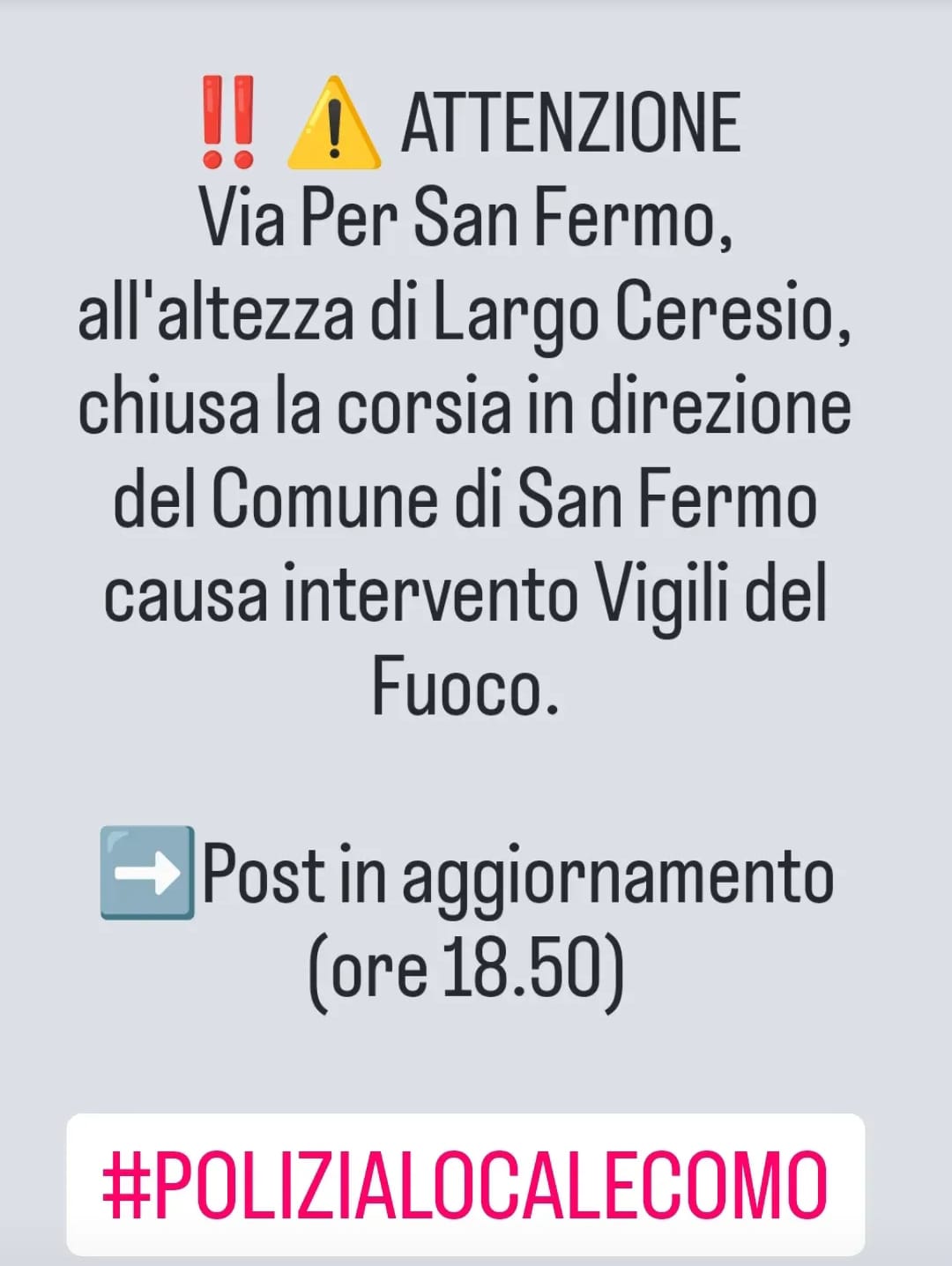 Vigili del fuoco in azione, poco prima delle 19, in via per San Fermo all’altezza di Largo Ceresio. La polizia locale di Como ha dovuto chiudere la corsia della strada in direzione del Comune di San Fermo per far intervenire i pompieri.