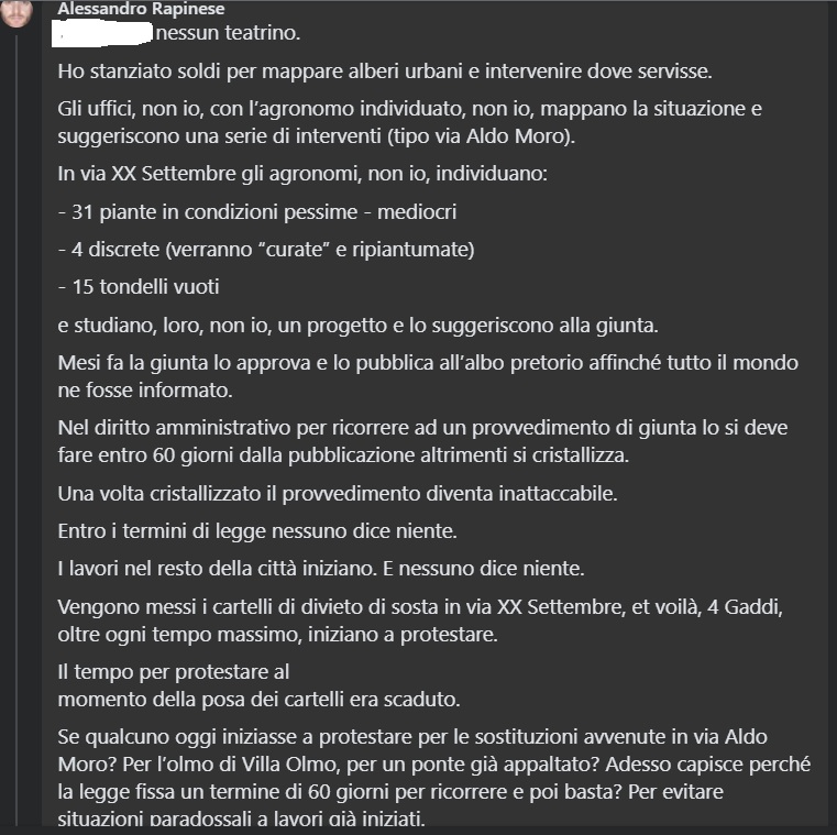 Ho stanziato soldi per mappare alberi urbani e intervenire dove servisse. Gli uffici, non io, con l’agronomo individuato, non io, mappano la situazione e suggeriscono una serie di interventi (tipo via Aldo Moro).