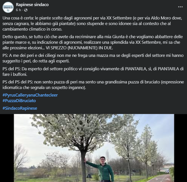 Una cosa è certa: le piante scelte dagli agronomi per via XX Settembre (e per via Aldo Moro dove, senza cagnara, le abbiamo già piantate) sono stupende e sono idonee sia al contesto che al cambiamento climatico in corso. Detto questo, se tutto ciò che avete da recriminare alla mia Giunta è che vogliamo abbattere delle piante marce e, su indicazione di agronomi, realizzare una splendida via XX Settembre, mi sa che alle prossime elezioni… VI SPIEZZO (NUOVAMENTE) IN DUE.