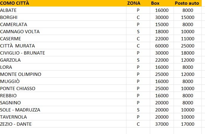 E a Como? I prezzi sono alti. Ecco alcuni esempi: Si parte da un box in città murata che può costare 60mila euro (25mila un posto auto). A seguire ecco i 37mila euro per un box in via Zezio-via Dante (17mila un posto auto). Sul terzo gradino del podio si colloca la coppia Civiglio-Brunate e zona Como Borghi (30 mila euro un box e rispettivamente 18mila e 15mila per un posto auto). In fondo alla graduatoria invece i 15 mila uro per un box a Camerlata (8mila per un posto auto).