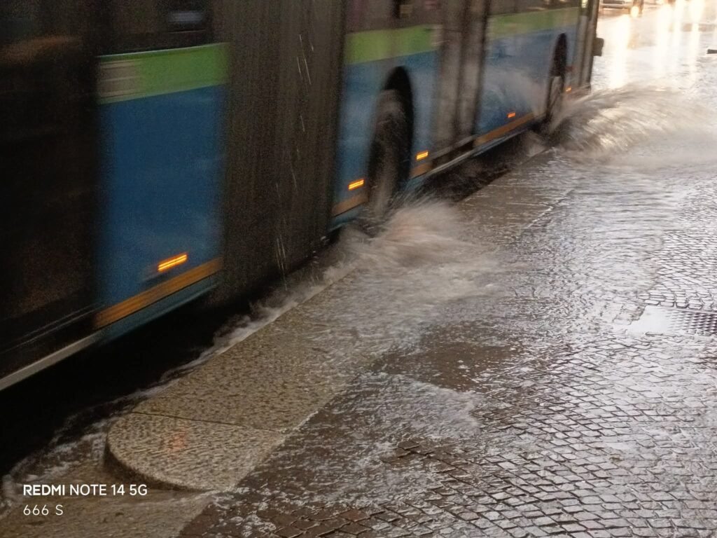 Per i pedoni, transitare sul marciapiede accanto alla preferenziale allagata è sempre a rischio e pericolo di doccia. Il breve filmato qui sotto dà un’idea.