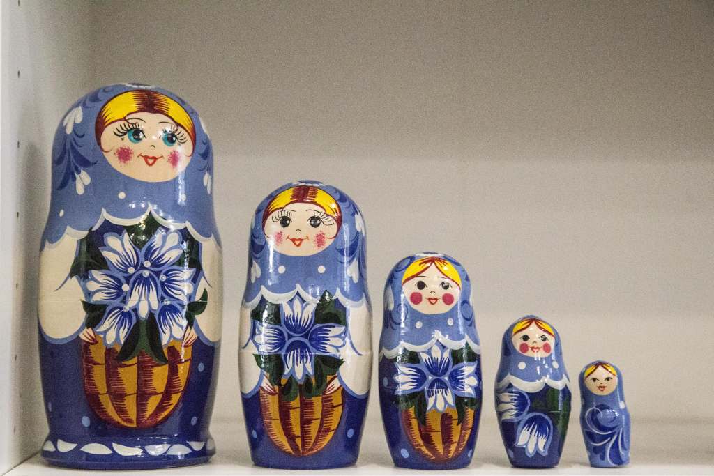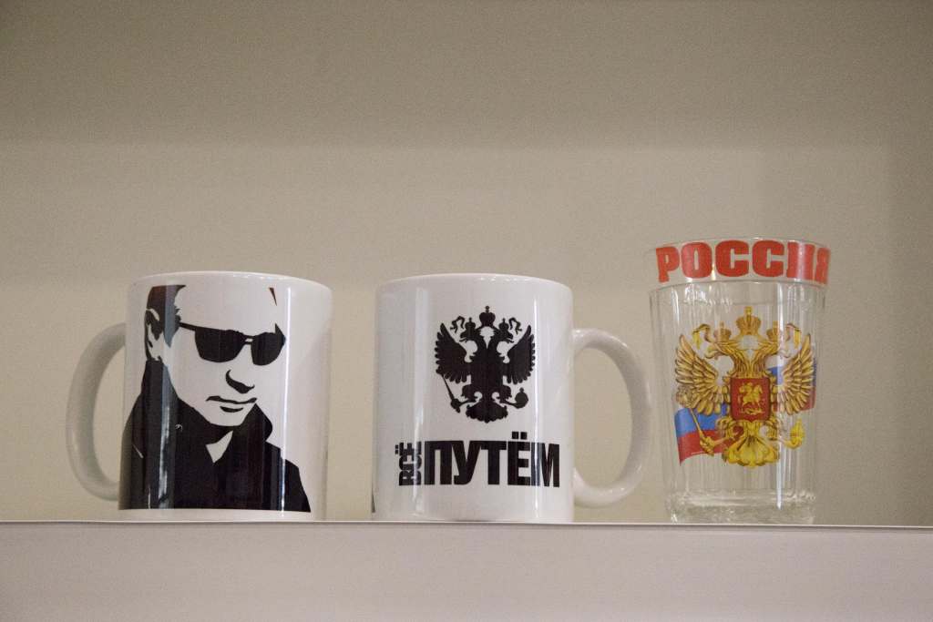 Caviale, pesce marinato, vino georgiano a riposo in barocche bottiglie allineate sugli scaffali dietro alla cassa, in esposizione insieme a matrioske colorate, bicchierini da vodka adornate con la bandiera della federazione russa e tazze da caffè con il volto di Vladimir Putin.