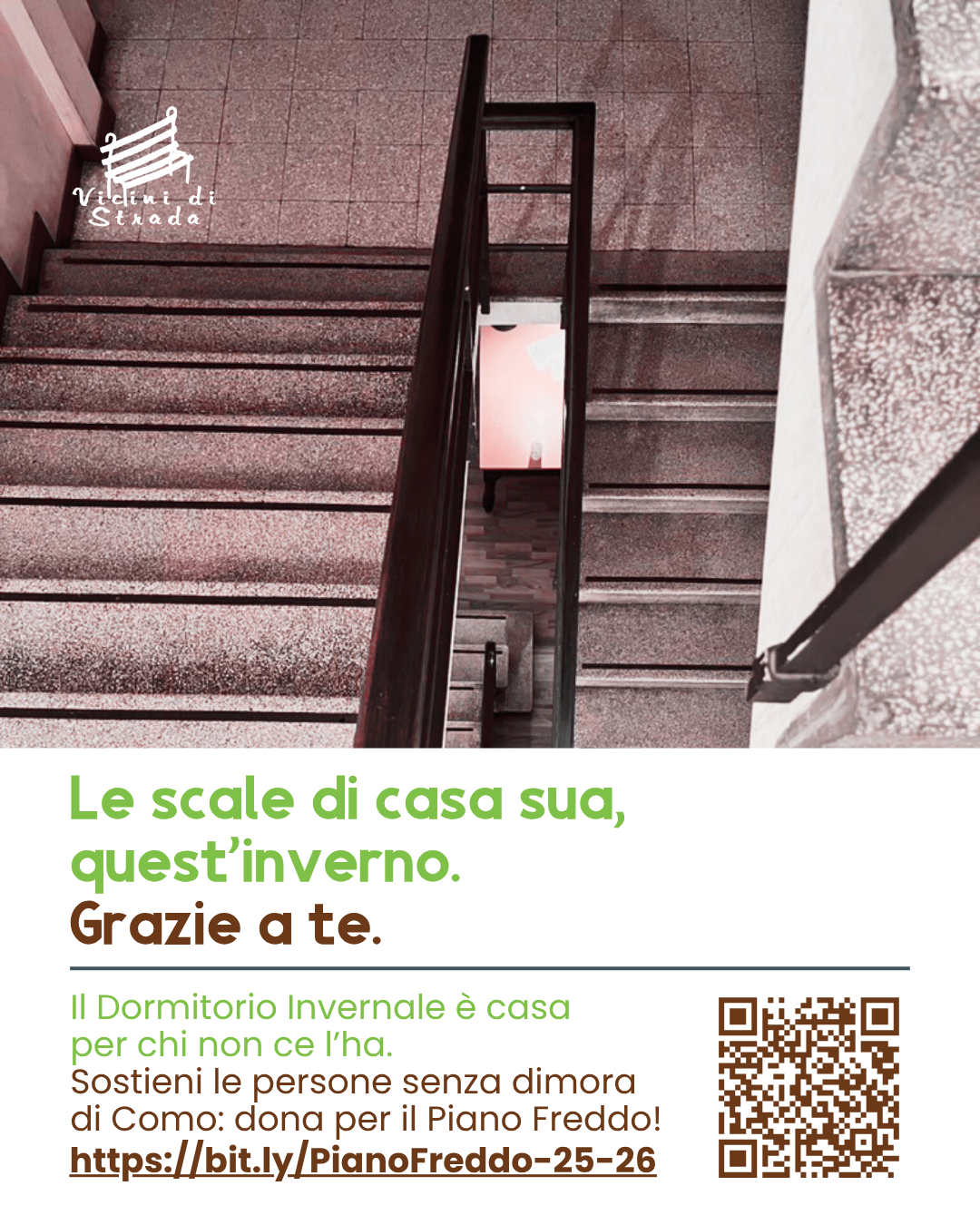 Quanto non coperto dalle risorse pubbliche rimane in carico a Vicini di Strada, che ha già lanciato – attraverso la piattaforma di Fondazione Comunitaria della Comunità Comasca – la campagna di sensibilizzazione e raccolta fondi “LA SUA CASA, QUEST’INVERNO” visibile al link https://dona.fondazione-comasca.it/campaigns/pianofreddo26/.