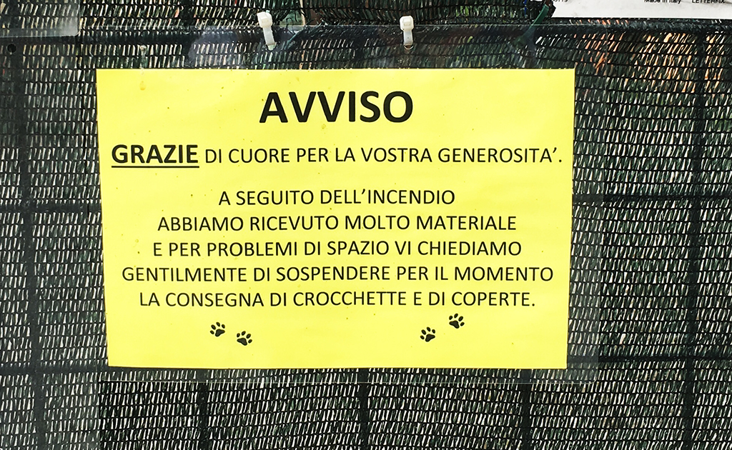 E non si parla solo di cibo e coperte (così tanti da dover appendere all’ingresso del canile un cartello che ringrazia ma invita a non portarne più, per il momento): in pochissimo tempo la raccolta fondi ha raggiunto una cifra inaspettata di 215 mila euro.