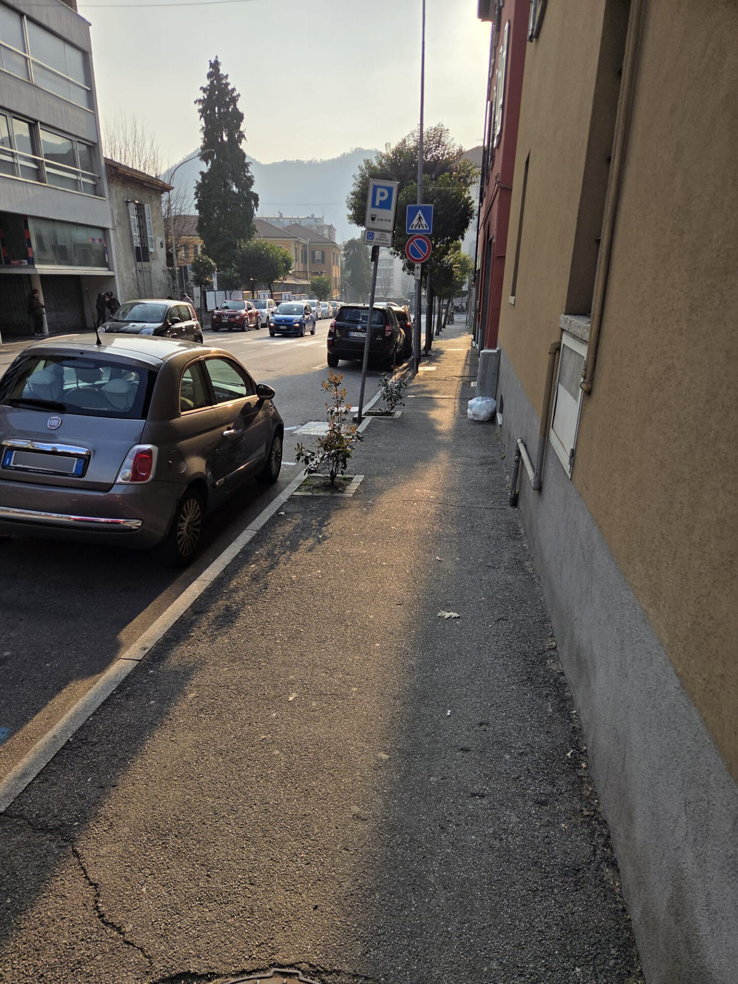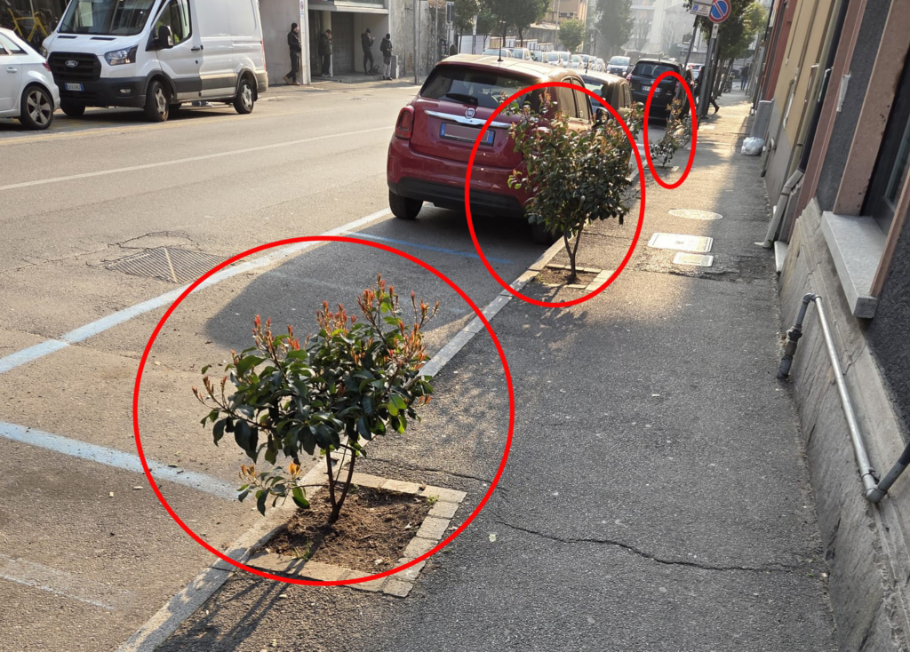 Oggi un lettore ci ha inviato due foto che, effettivamente, destano l’attenzione. Al posto di (almeno) tre spazi di terra destinati agli alberi sono spuntati quelli che almeno all’occhio profano tutto paiono tranne futuri fusti simili a quelli che si vedono lungo parte successiva del marciapiede.