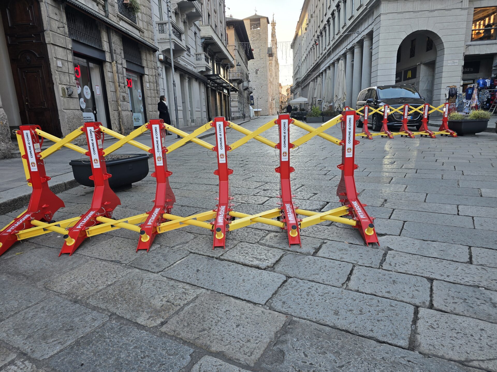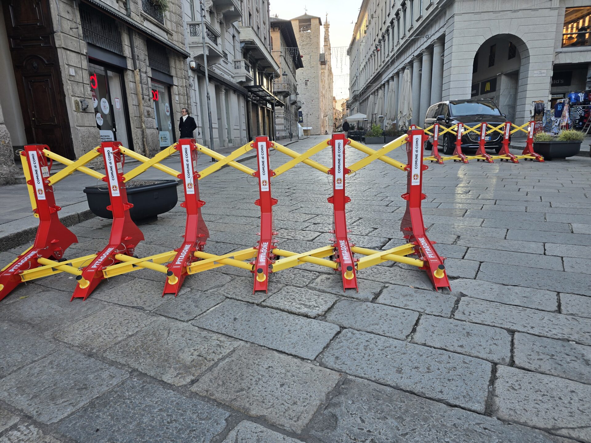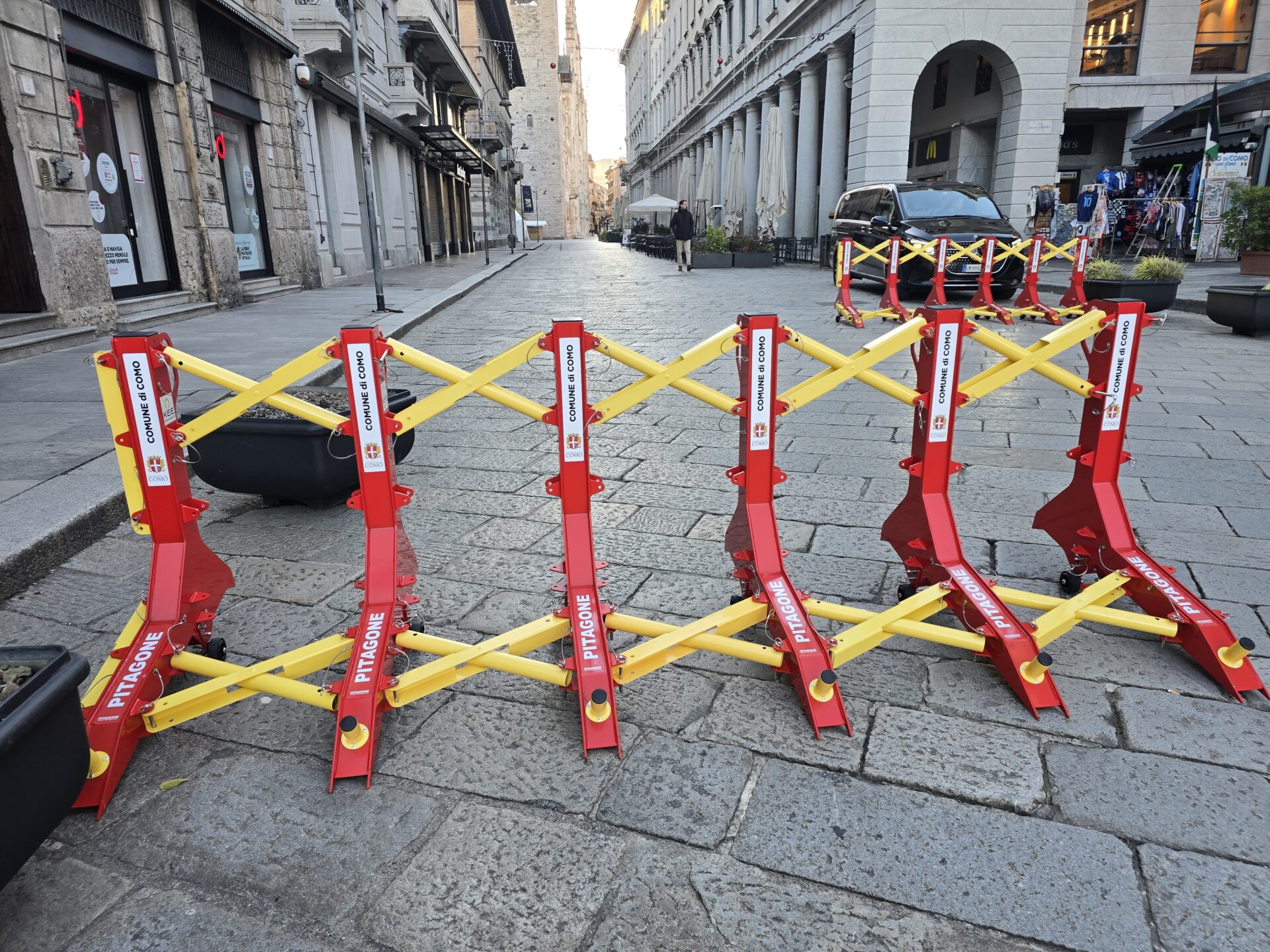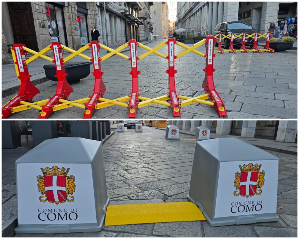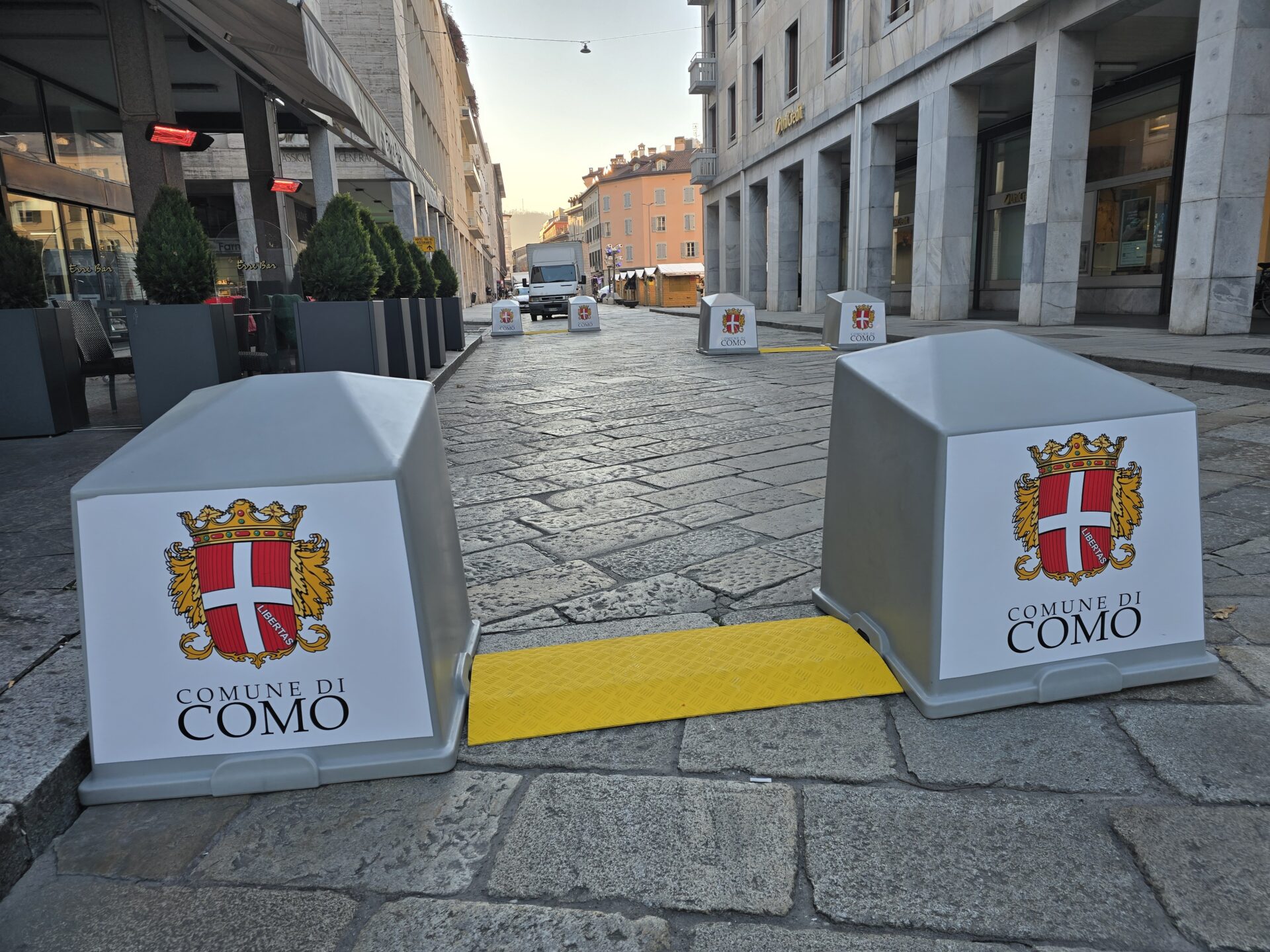 Oltre alle recinzioni, posizionate a serpentina all’inizio di via Plinio per garantire il rallentamento di qualsiasi mezzo in transito, sono stati posizionati a terra anche delle specie di panettoni bianchi con la grossa scritta ‘Comune di Como’ e lo stemma ufficiale.
