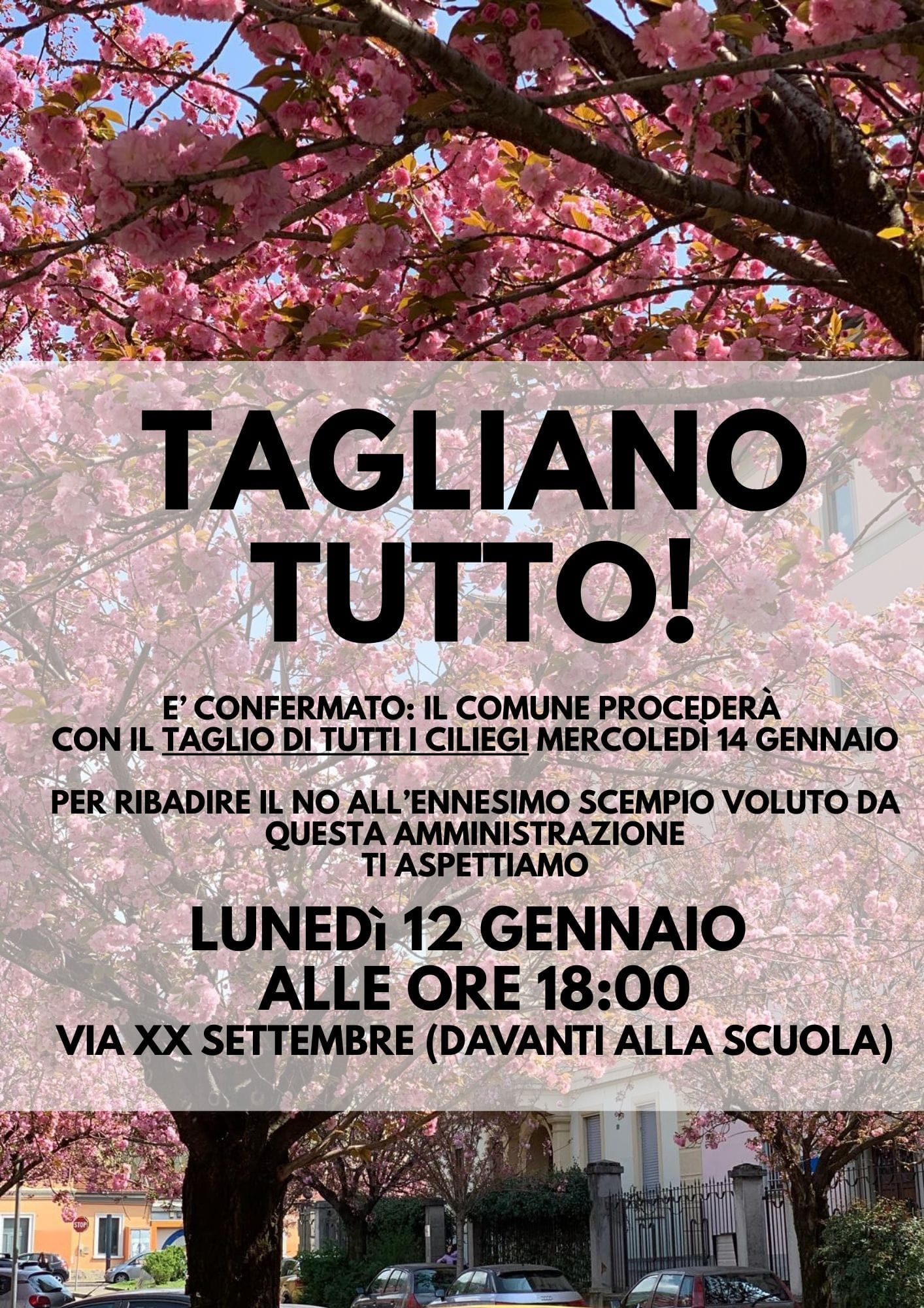 Sembra arrivato il momento decisivo per i ciliegi di via XX Settembre. Questa mattina, lunedì 12 gennaio, lungo la strada e accanto alle piante sono ricomparsi i cartelli di divieto di sosta e rimozione forzata. A posare gli avvisi, l’azienda Peverelli, ovvero la stessa incaricata dal Comune di Como di tagliare i ciliegi già a metà novembre ma poi ‘respinta’ – almeno in via XX – dalla mobilitazione dei cittadini, che a dicembre riuscirono anche a stoppare momentaneamente l’operazione rivolgendosi al Tar (qui il provvedimento).