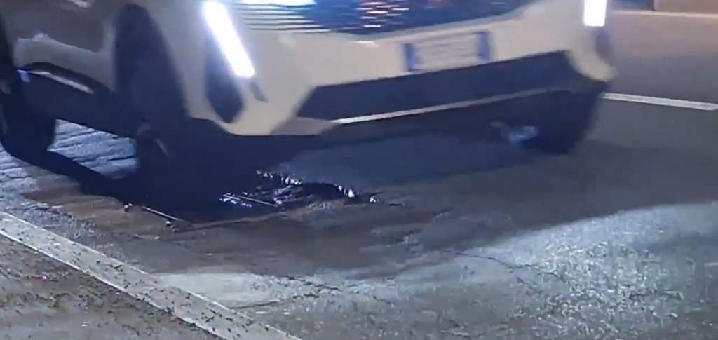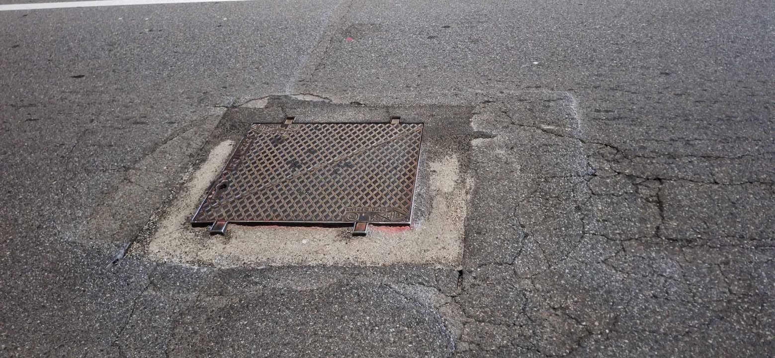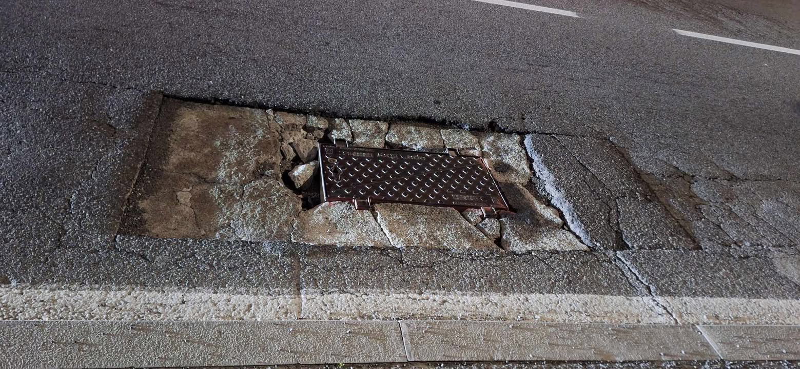 Ci sono questi due tombini traballanti a causa di fratture del cemento e dell’asfalto mancante, sono anche molto pericolosi per moto, auto, etc, oltre al rumore che fanno ad ogni passaggio.