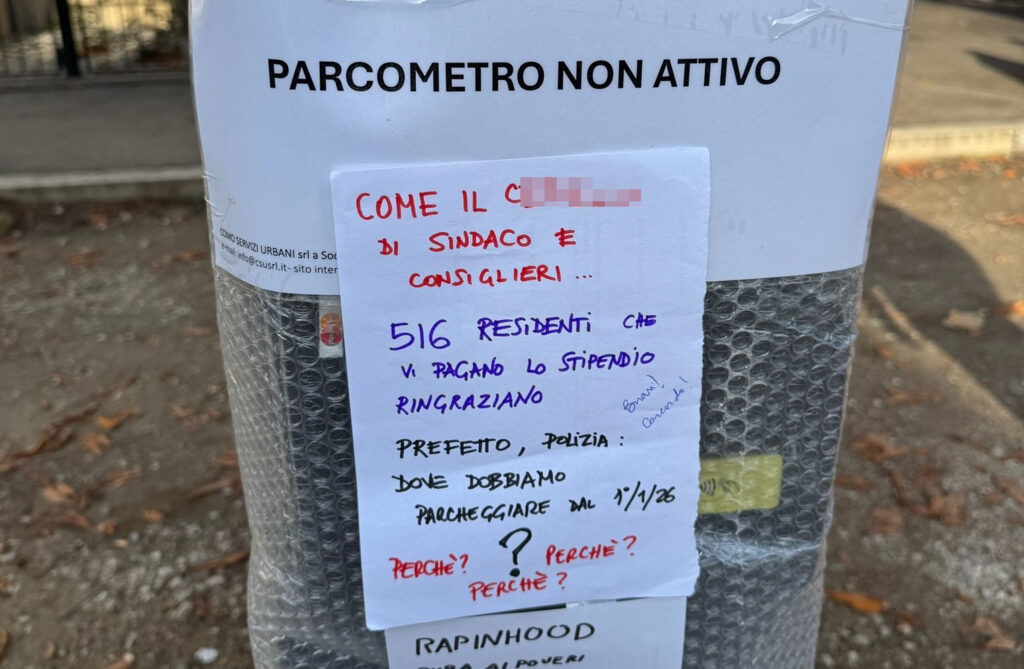 In questo caso, sembrano addirittura vergati a più mani i messaggi, anche in diversi colori. Si va dal ricorso a una tipica espressione in dialetto lombardo, fino al parallelo (ovviamente metaforico) con un Robin Hood al contrario. Colpisce – anche se ovviamente i numeri sarebbero tutti da verificare – la scritta riferita ai “516 residenti che vi pagano lo stipendio” che “ringraziano”. Il riferimento numerico potrebbe essere al primo numero complessivo, tra residenti senza posto auto e residenti con posto auto, esclusi almeno nelle primissime battute dalle assegnazioni degli stalli comunali (con una graduatoria che, però, ha già smaltito almeno una parte di questa lista d’attesa).