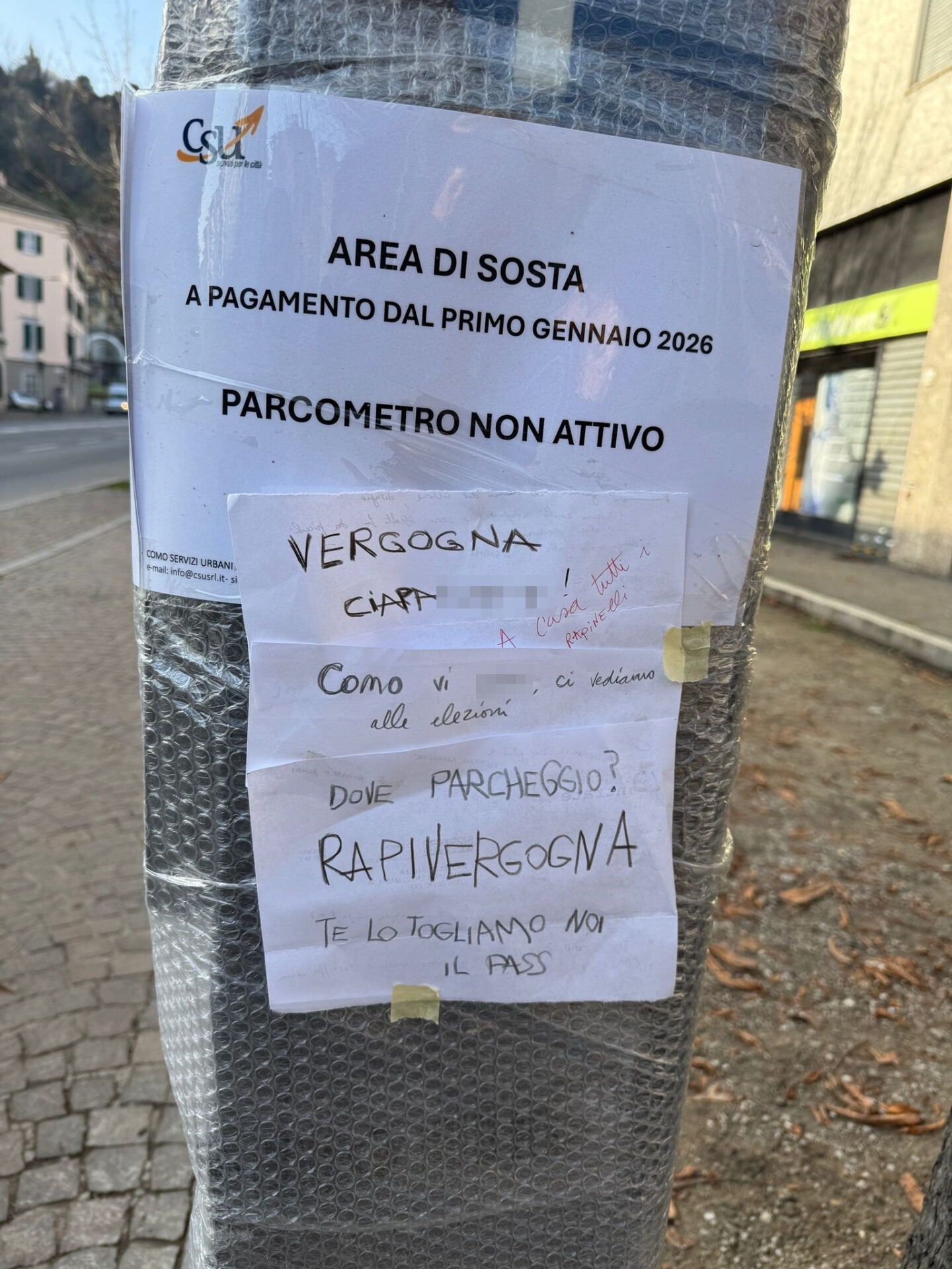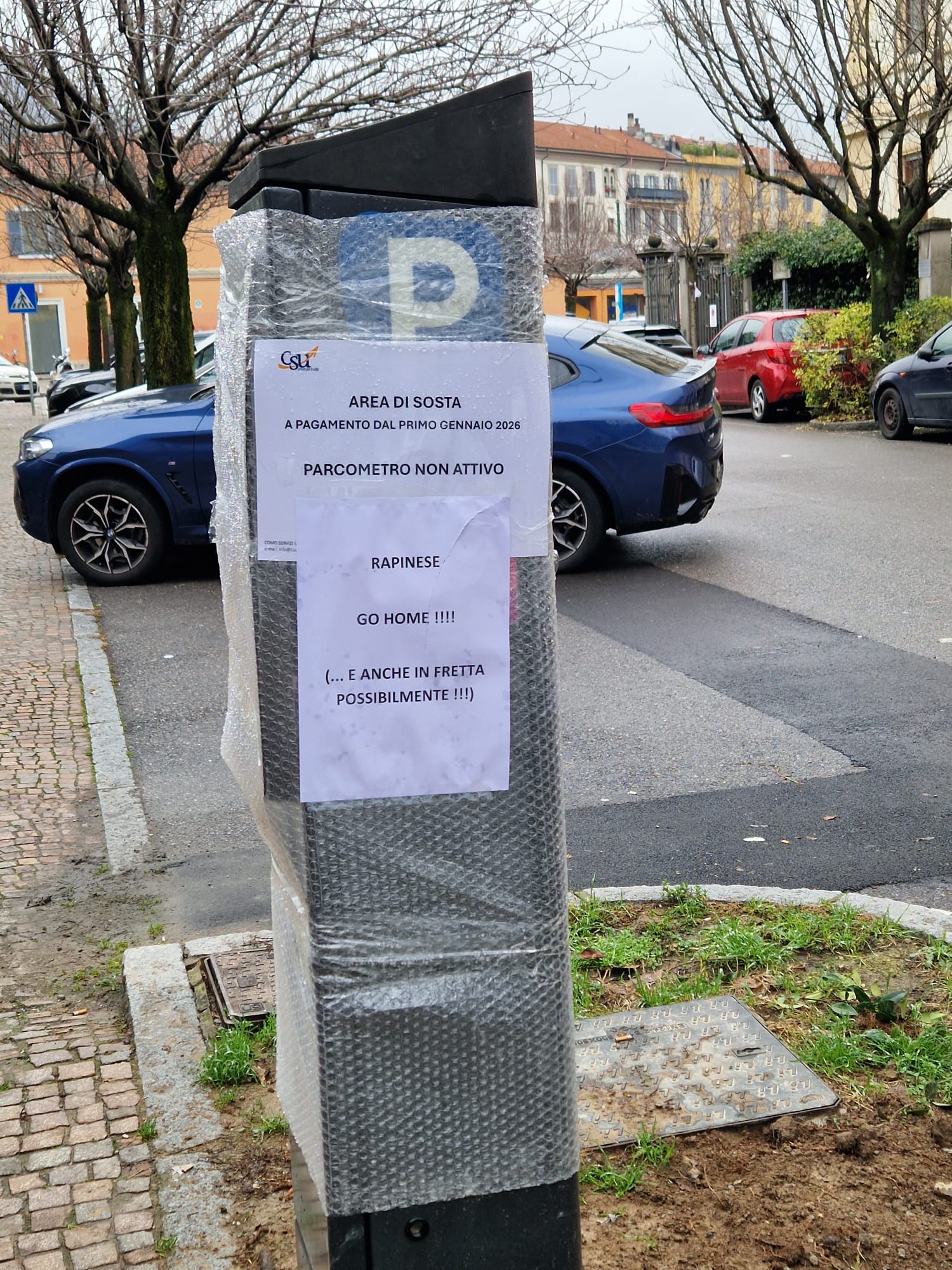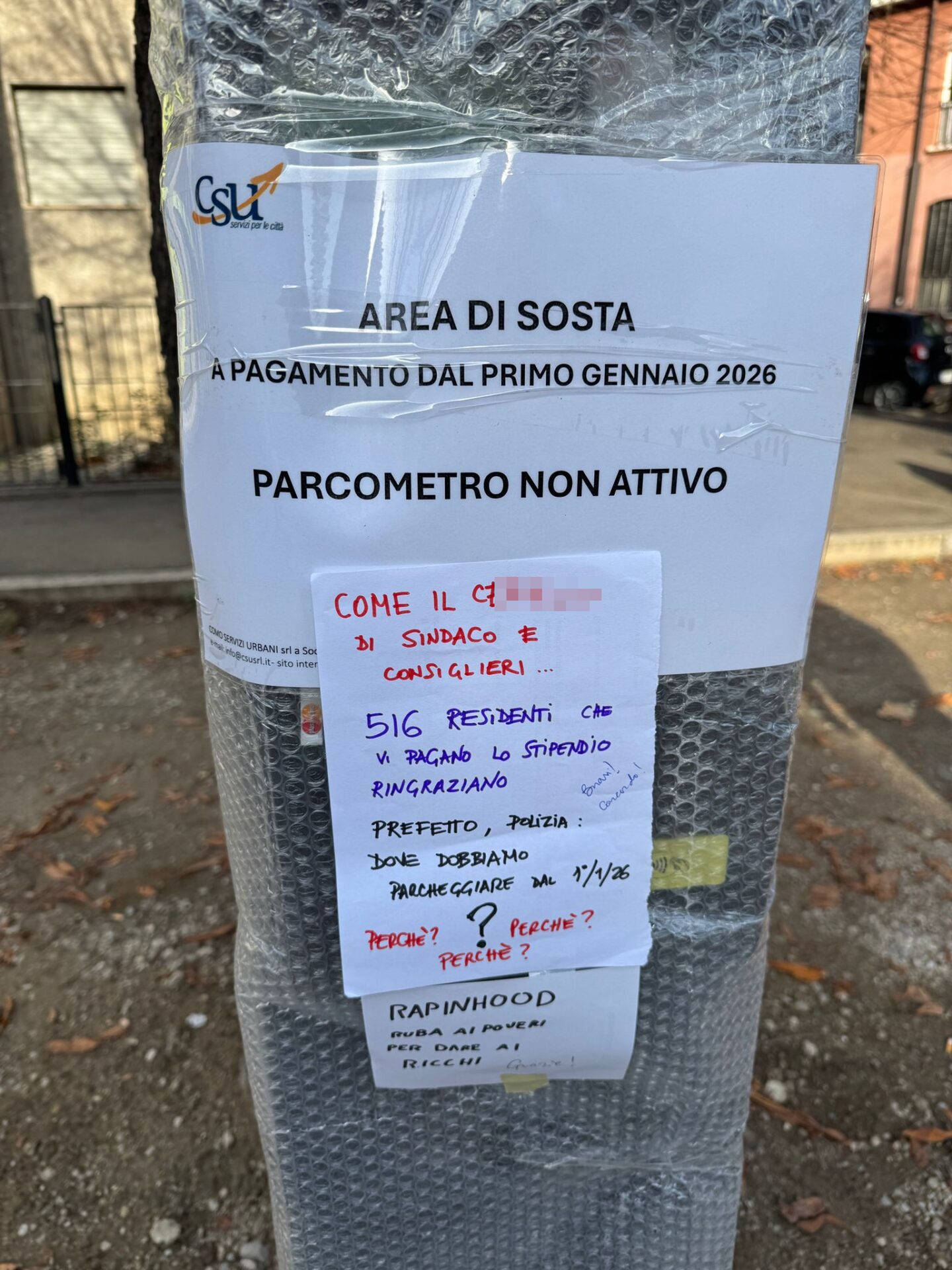 A ruota, era apparso un segnale di protesta su un altro parcometro nuovo (e non ancora attivo), in questo caso in via Brambilla.