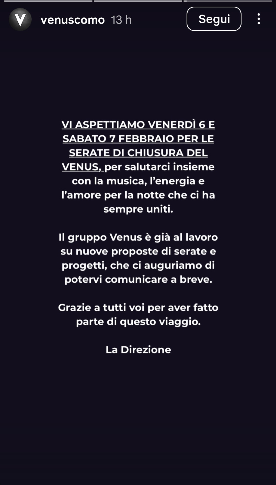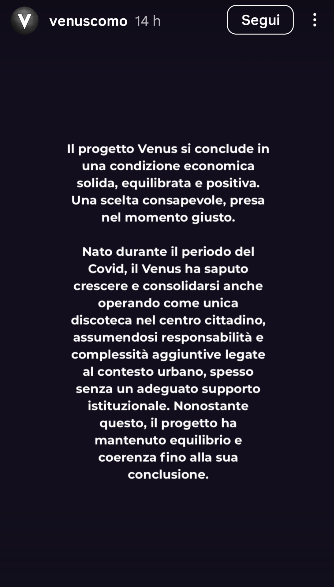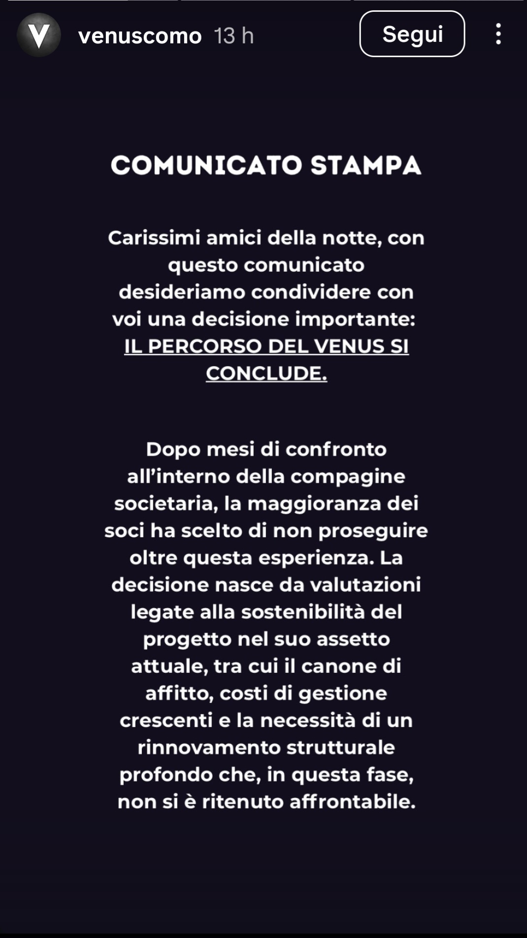 Carissimi amici della notte con questo comunicato desideriamo condividere con voi una decisione importante: il percorso del Venus si conclude. Dopo mesi di confronto all’interno della compagine societaria, la maggioranza dei soci ha scelto di non proseguire oltre questa esperienza.