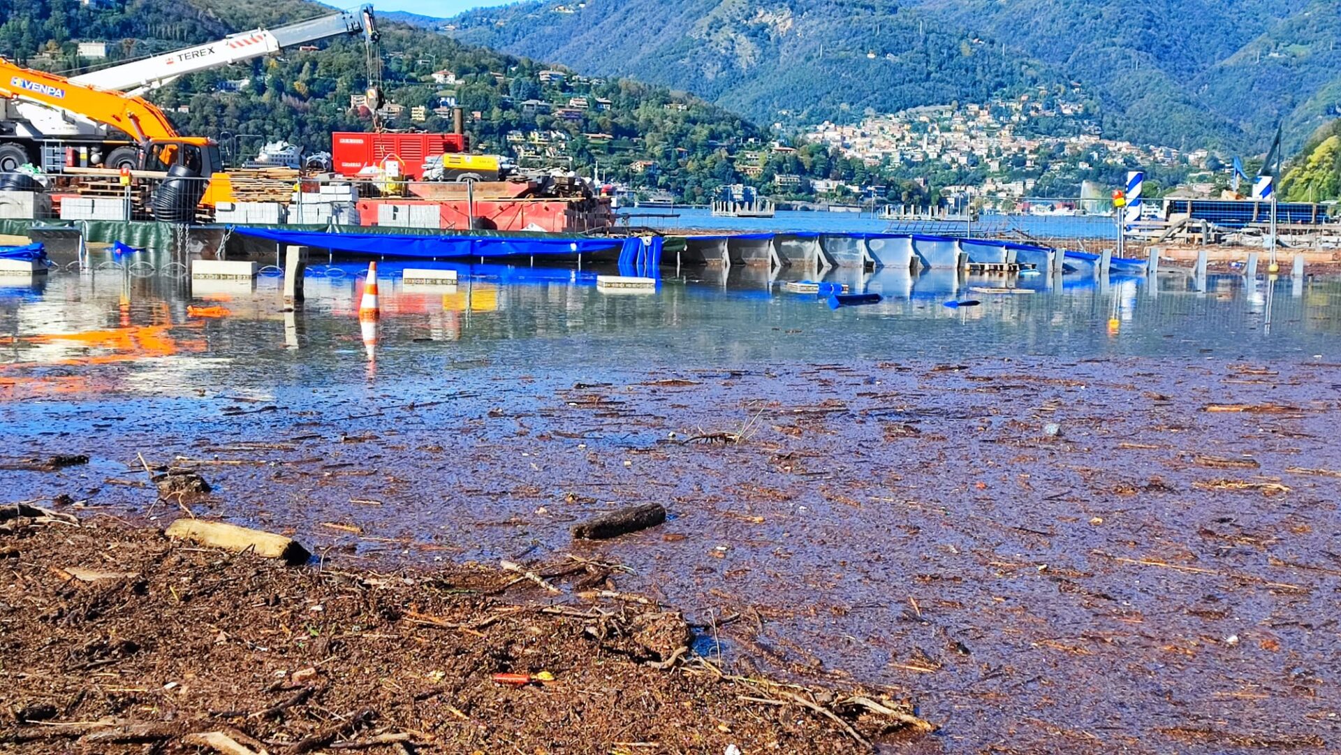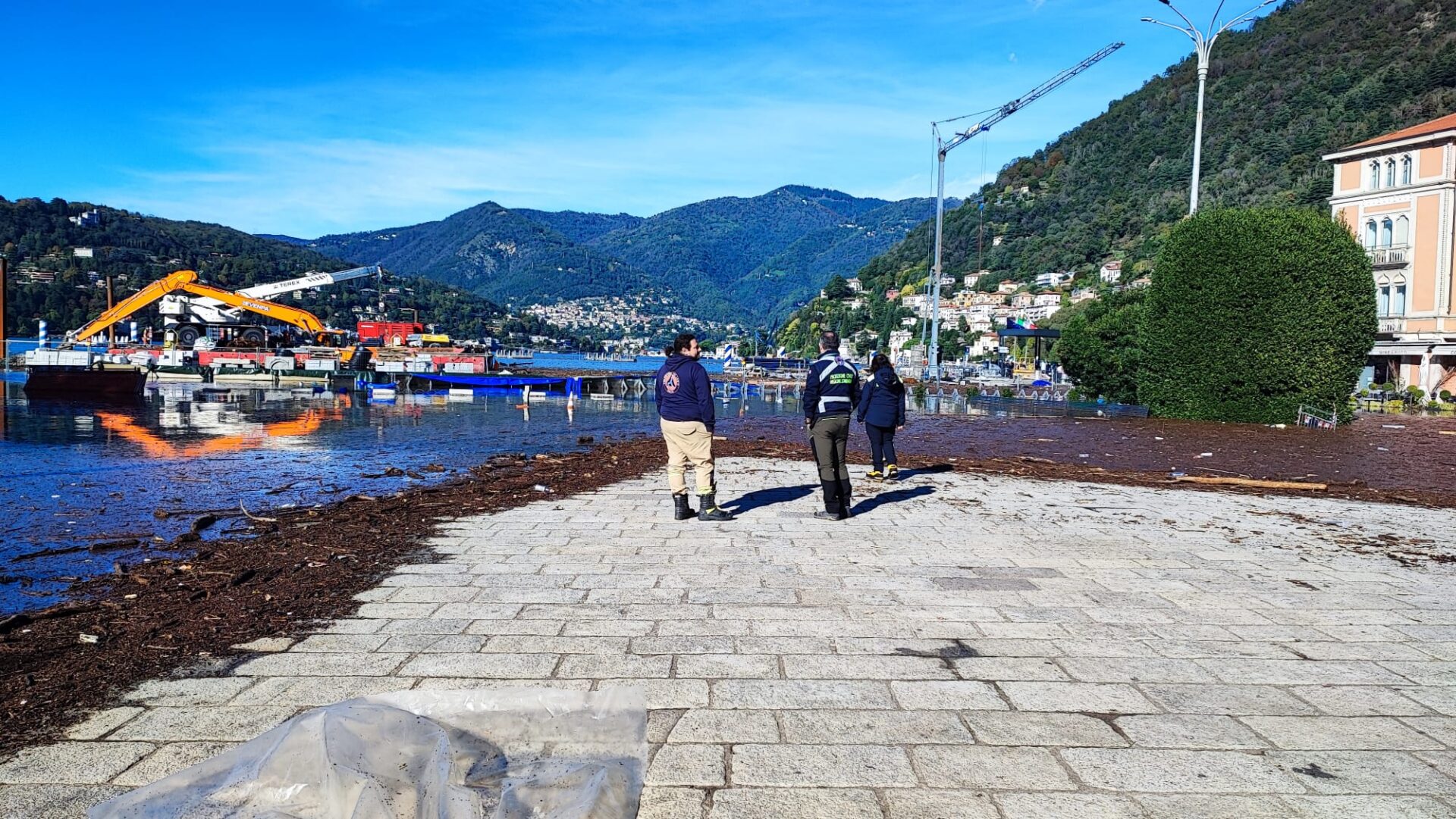 14.27 In corso in queste ore il montaggio delle passerelle per i pedoni sul lungolago: