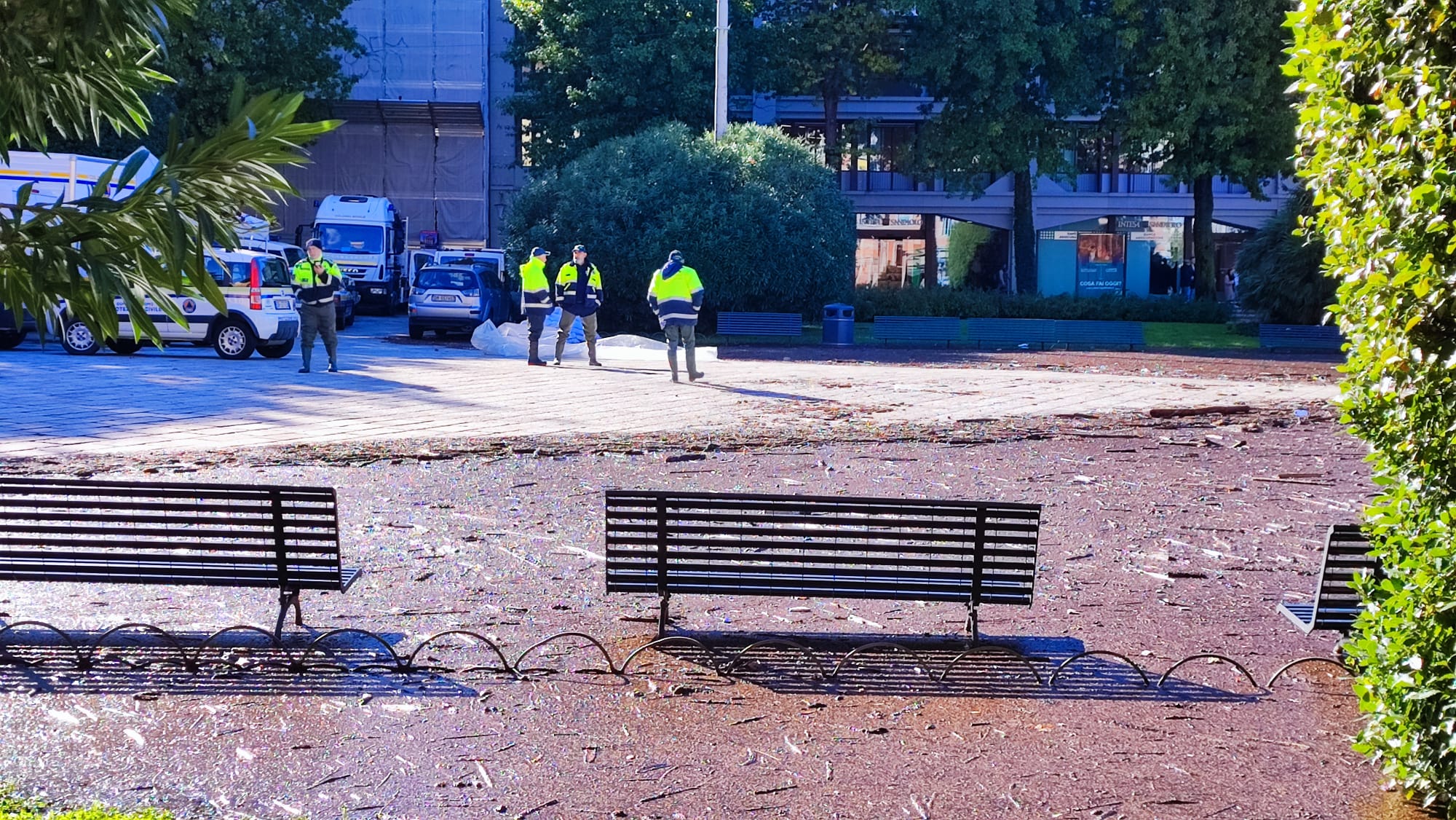 12.40 In piazza Cavour la a Protezione Civile sta posizionando e distribuendo sacchi di sabbia.