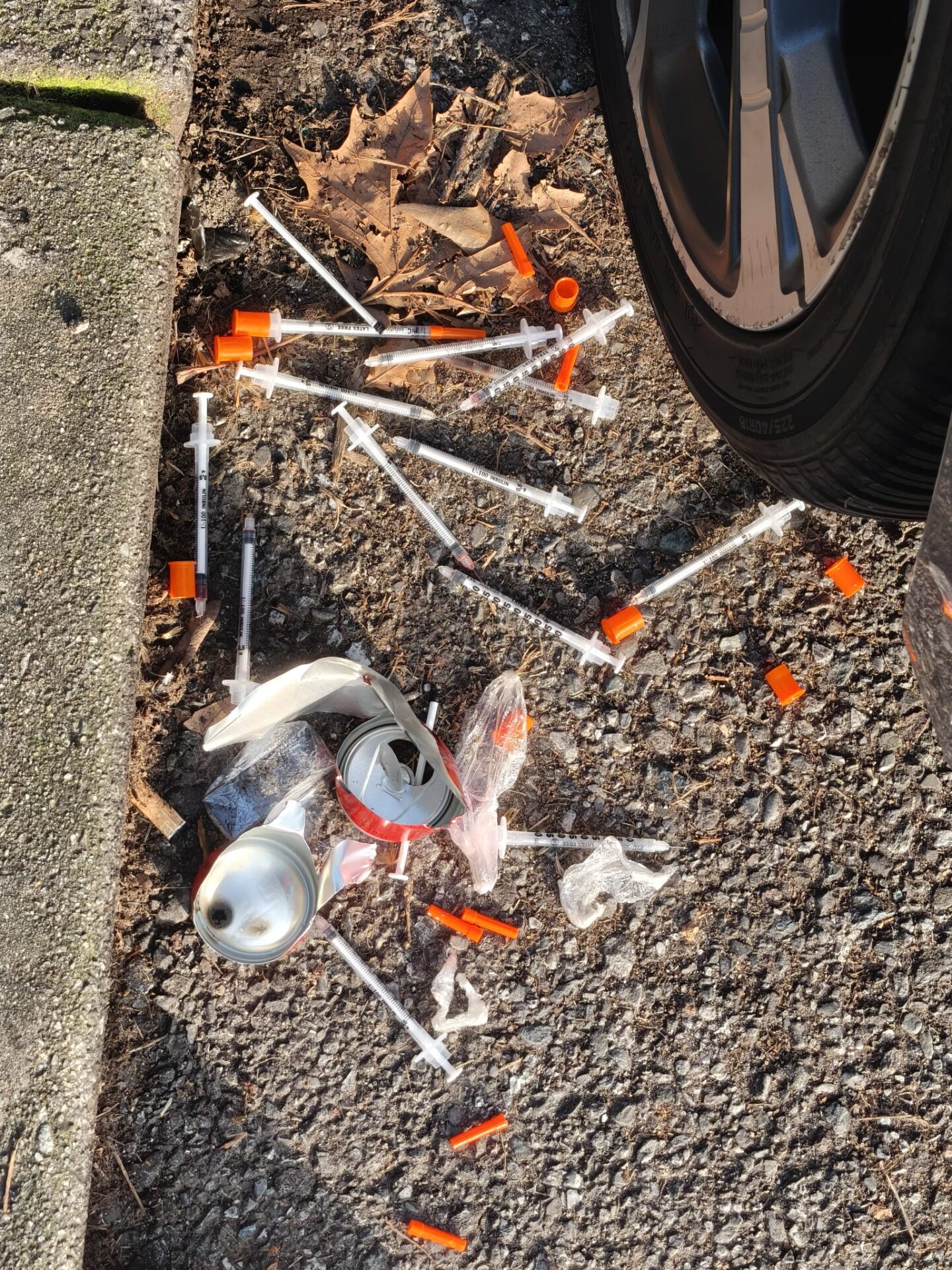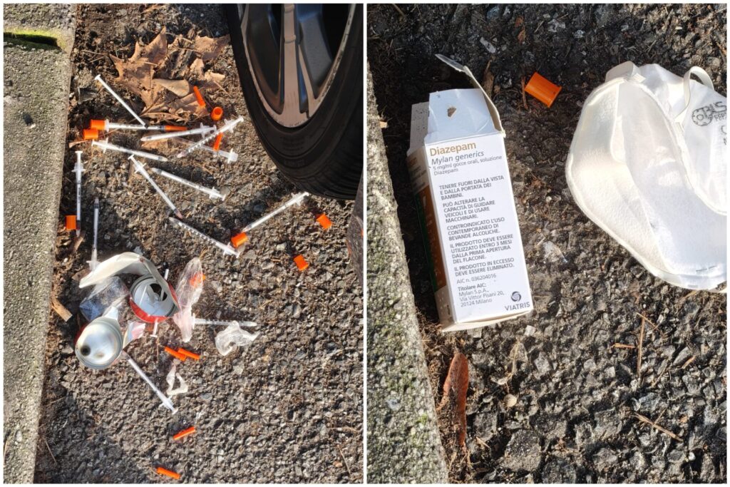 Segnalazione agghiaciante dalla zona del parco di via Traù a Como, nel quartiere di Tavernola. Le foto, in realtà, già parlano da sole. Al bordo di un marciapiede, in piena strada tra le auto in sosta, è stata trovata una vera e propria distesa di siringhe. Accanto, anche una confezione di una farmaco.