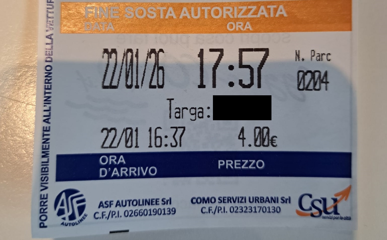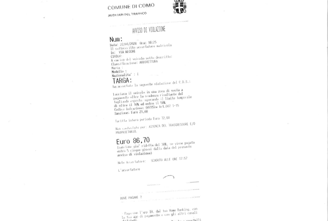 L’accertatore di Como Servizi Urbani è passato a controllare alle 18.25, momento in cui è stata rilevata l’infrazione ed è quindi scattata la multa sotto il parabrezza. Per quei 28 minuti di ritardo rispetto alla scadenza del biglietto, ecco la multa record (da cui abbiamo ovviamente cancellato i dati sensibili): 86,70 euro.