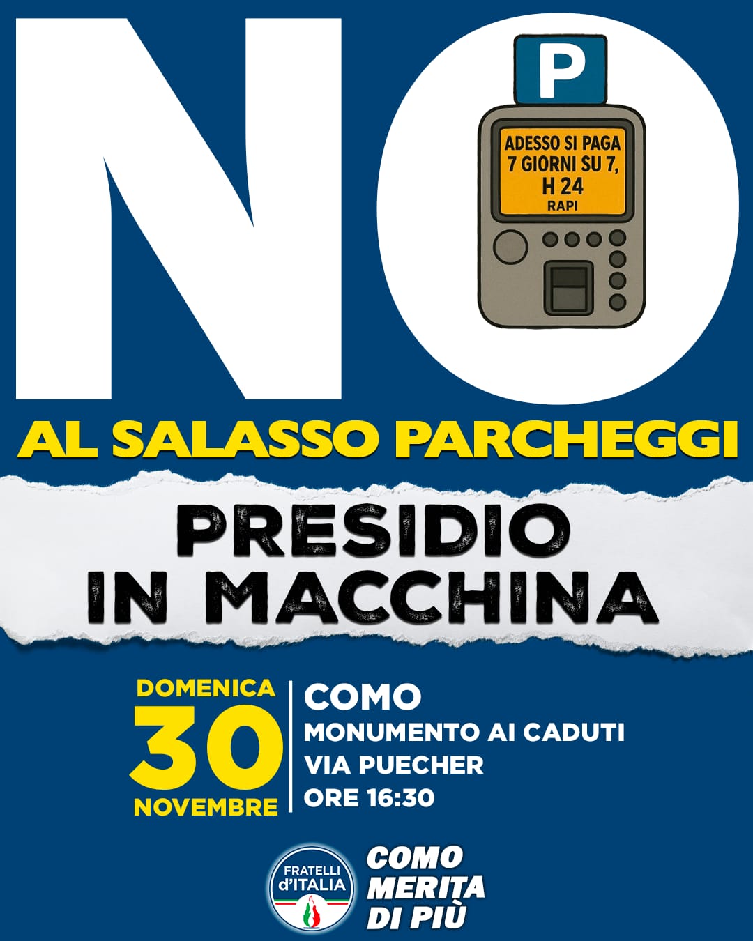 Fratelli d’Italia annuncia per domenica 30 novembre, alle ore 16:30, un presidio in macchina al Monumento ai Caduti, in viale Puecher, per protestare contro il nuovo sistema della sosta introdotto dall’amministrazione Rapinese. Il provvedimento, che estende la sosta a pagamento 7 giorni su 7, 24 ore su 24 ed elimina completamente la gratuità nei festivi, si somma agli aumenti già introdotti nel 2024 e rappresenta un ulteriore e ingiustificato aggravio per i comaschi. Un salasso che rischia di essere insostenibile per migliaia di famiglie, lavoratori, commercianti e studenti, già colpiti da un sistema della sosta che oggi appare più punitivo che funzionale.