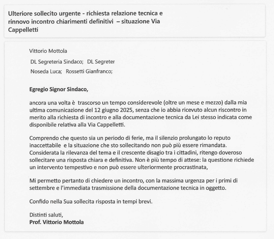 Da mesi i residenti di Via Cappelletti chiedono formalmente all’Amministrazione comunale un incontro per un chiarimento ufficiale su una questione tutt’altro che marginale: la natura della via, pubblica o privata, e le conseguenti responsabilità in termini di manutenzione e sicurezza.