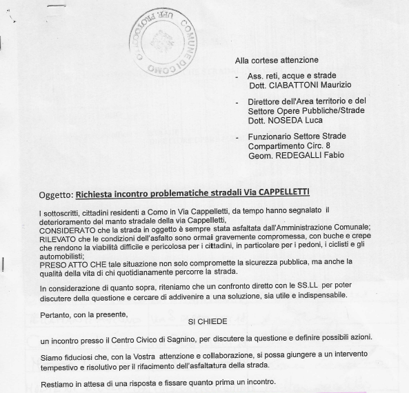 Da mesi i residenti di Via Cappelletti chiedono formalmente all’Amministrazione comunale un incontro per un chiarimento ufficiale su una questione tutt’altro che marginale: la natura della via, pubblica o privata, e le conseguenti responsabilità in termini di manutenzione e sicurezza.