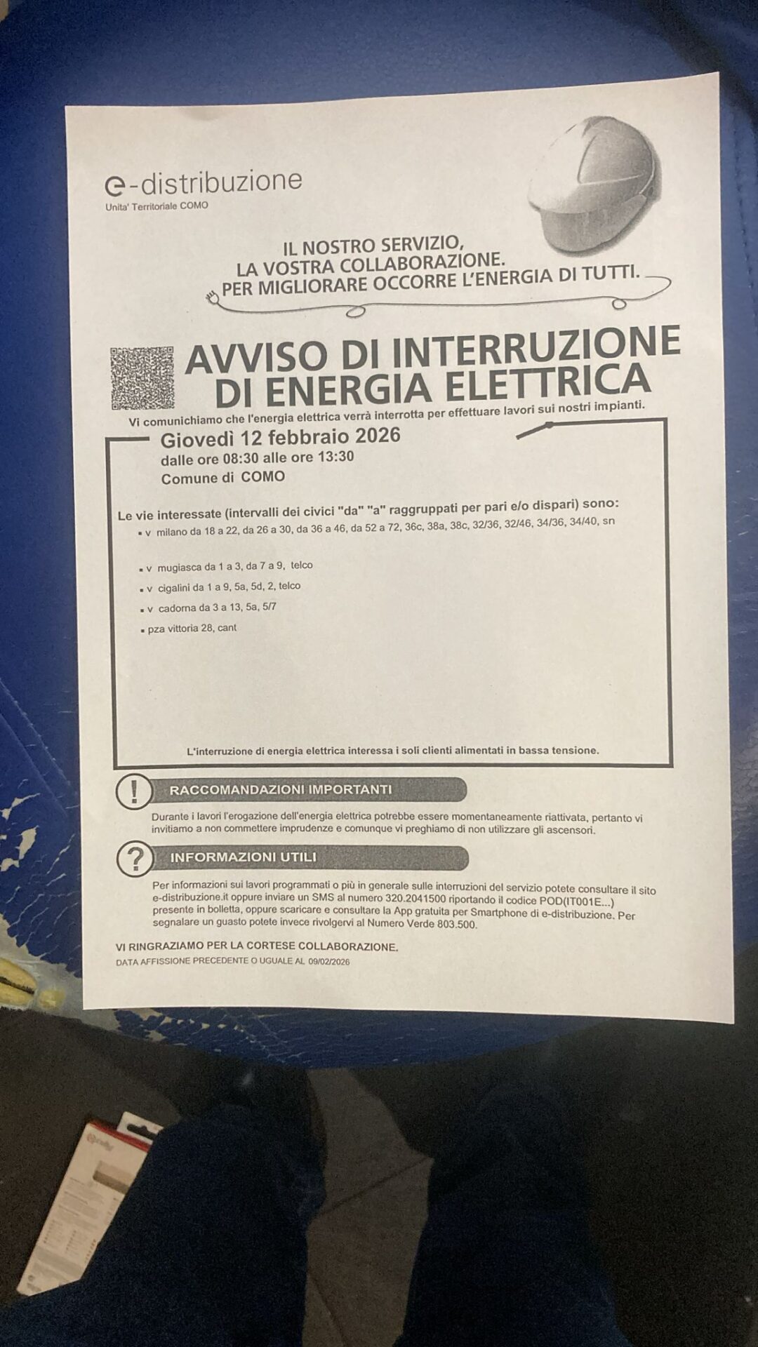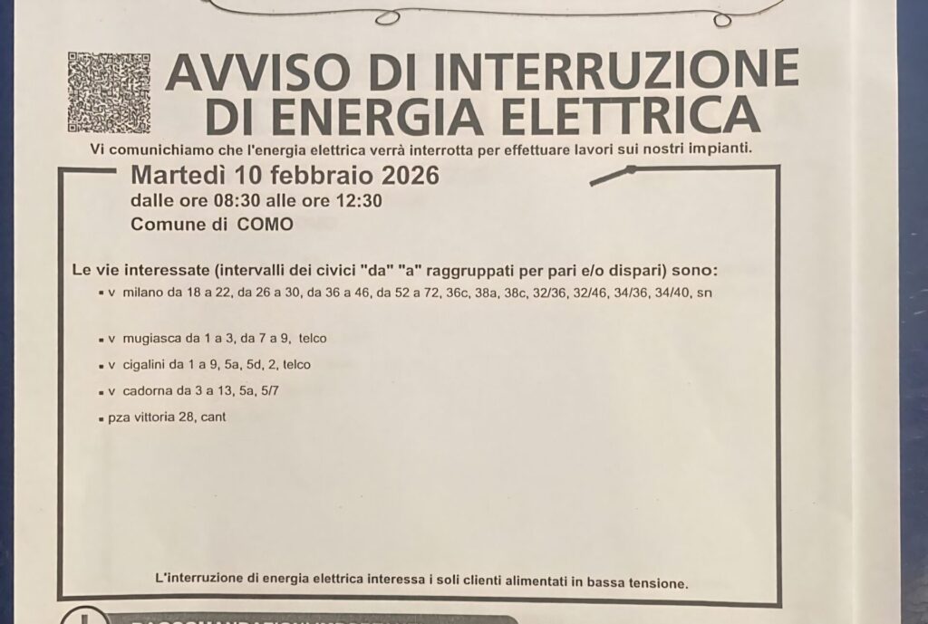 Malumori forti nella zona di via Milano a Como per un annuncio che rischia di mettere in difficoltà le attività economiche. E-Distribuzione, infatti, ha affisso nella via i volantini che annunciano il distacco dell’energia elettrica nella zona per ben due mattinate intere, con ovvie ripercussioni sui negozi. Le zone interessate sono, per l’appunto, via Milano, via Mugiasca, via Cigalini, via Cadorna e piazza Vittoria.