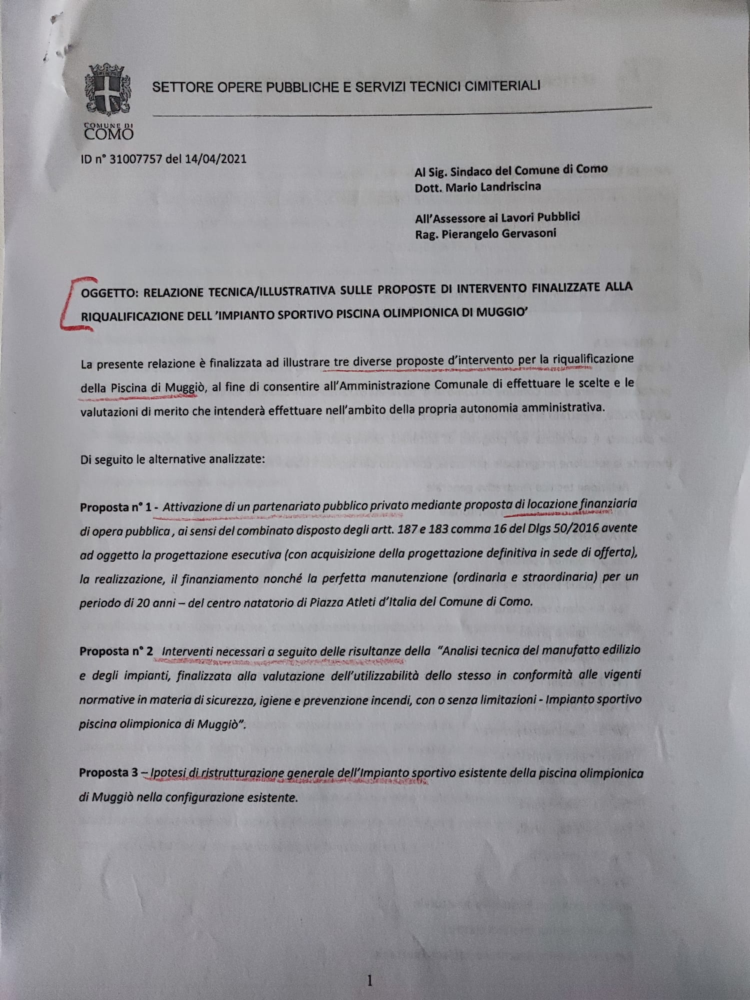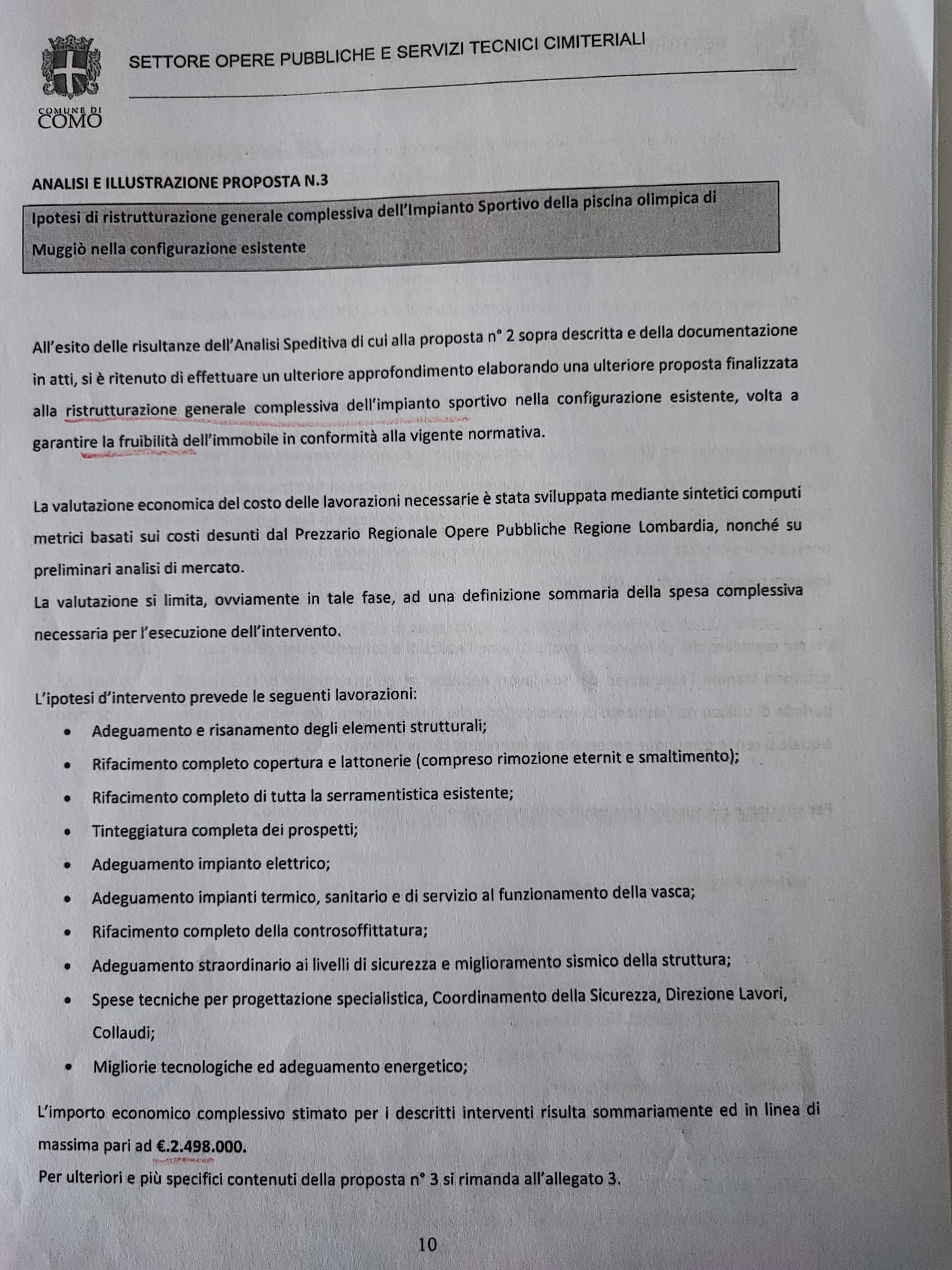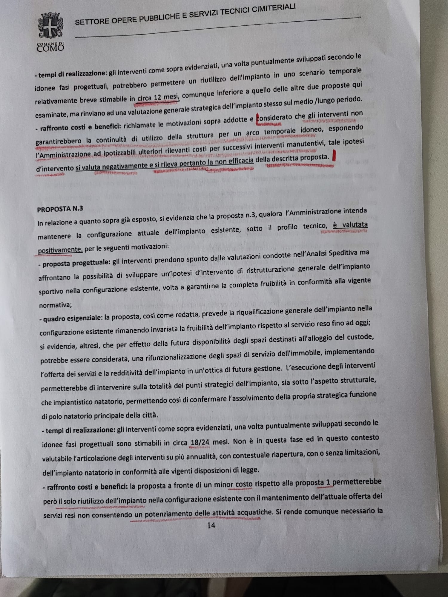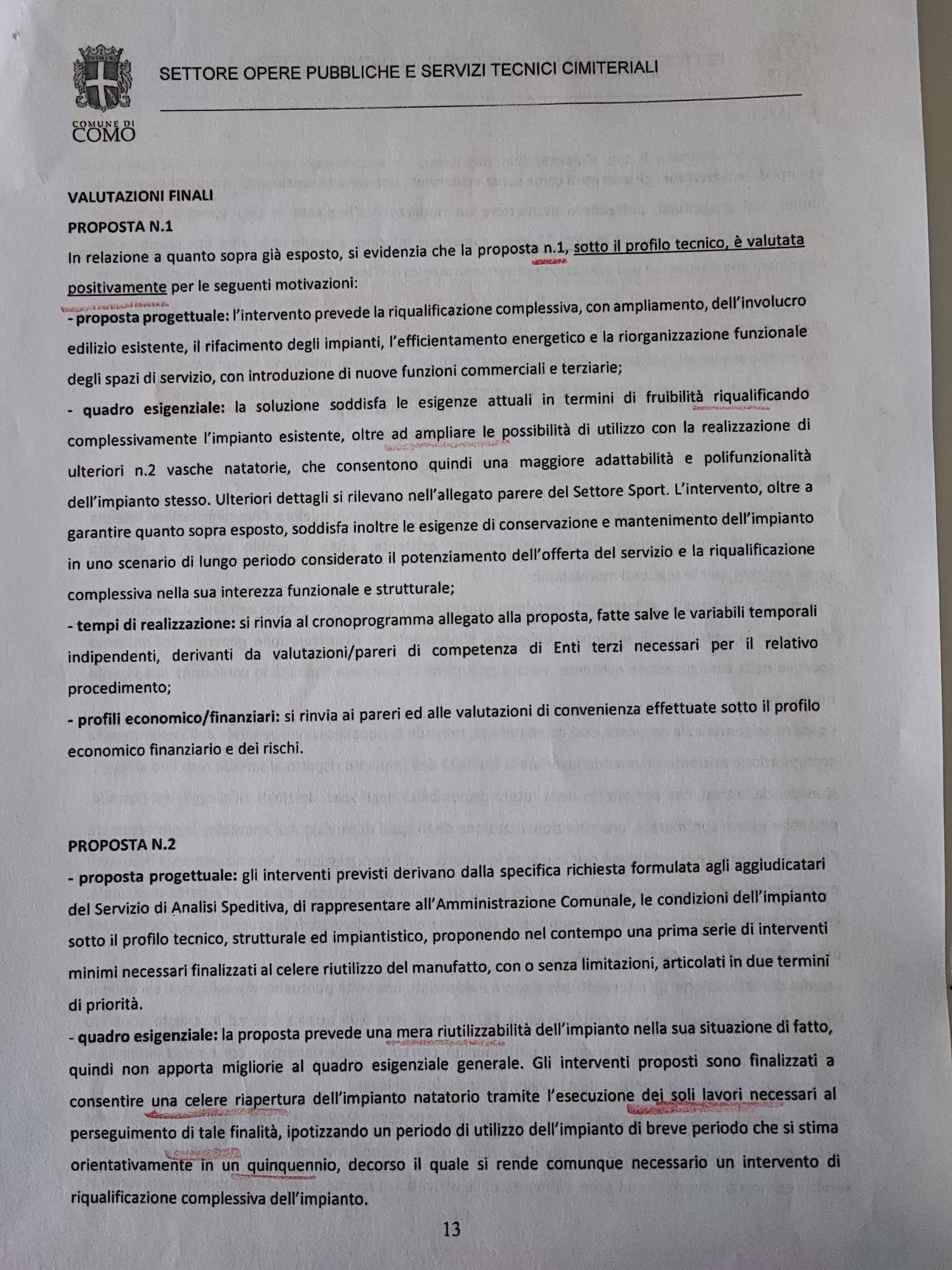 Aggiunge poi Nessi: “Nel frattempo la piscina resta chiusa sine die in preda al degrado. Abbiamo denunciato in consiglio comunale, mostrando il testo originale, che la famosa relazione sventolata in campagna elettorale da Rapinese in realtà diceva il contrario di quanto da lui sostenuto e cioè che la ristrutturazione a breve promessa dal sindaco era stata valutata negativamente dai tecnici in quanto definita “non efficace”. In questa vicenda sta tutta l’inaffidabilità di Rapinese”. Ecco il documento: