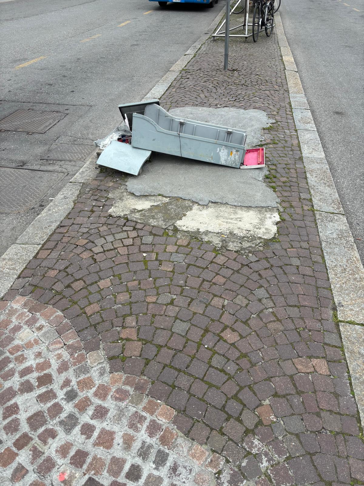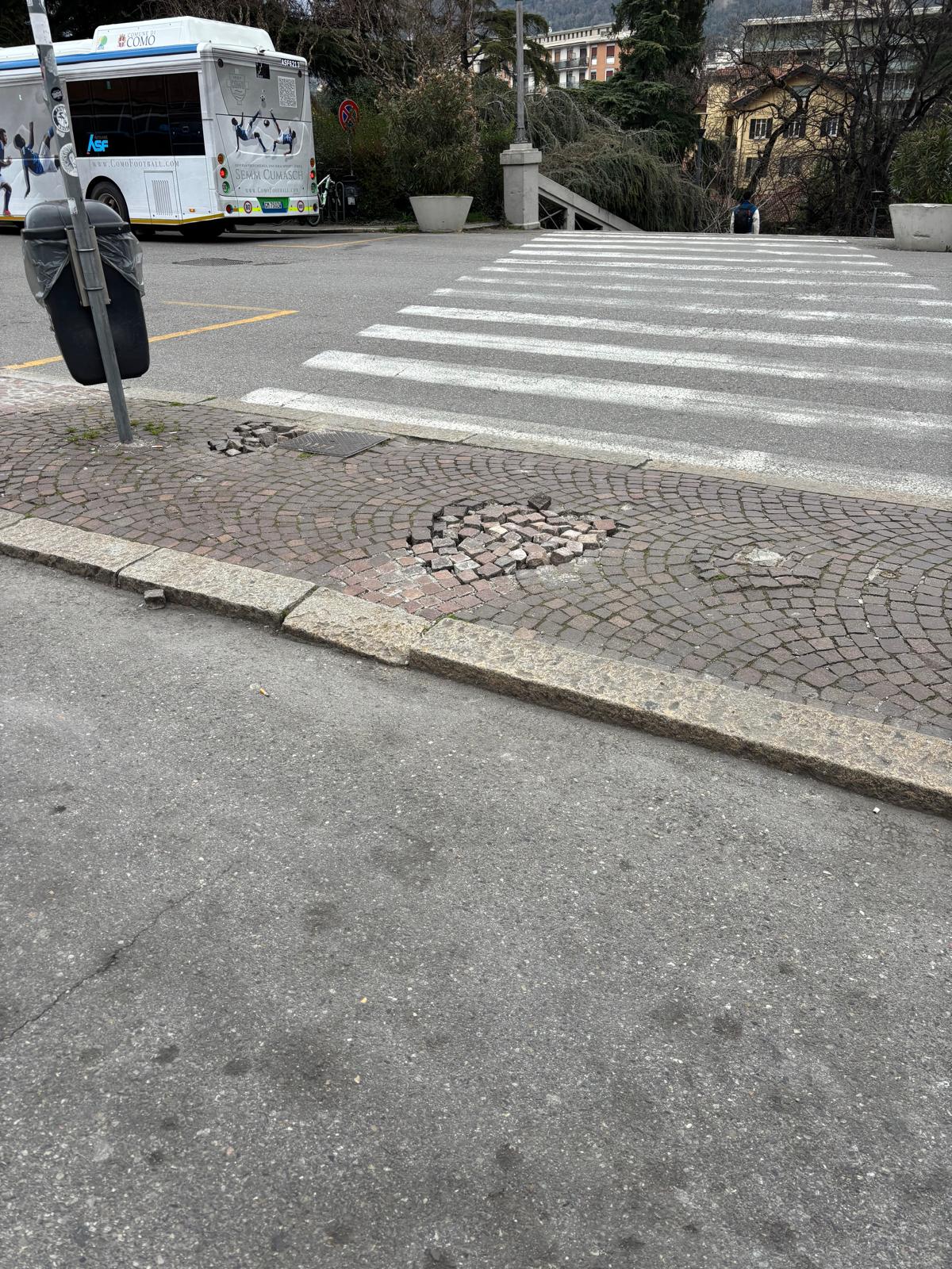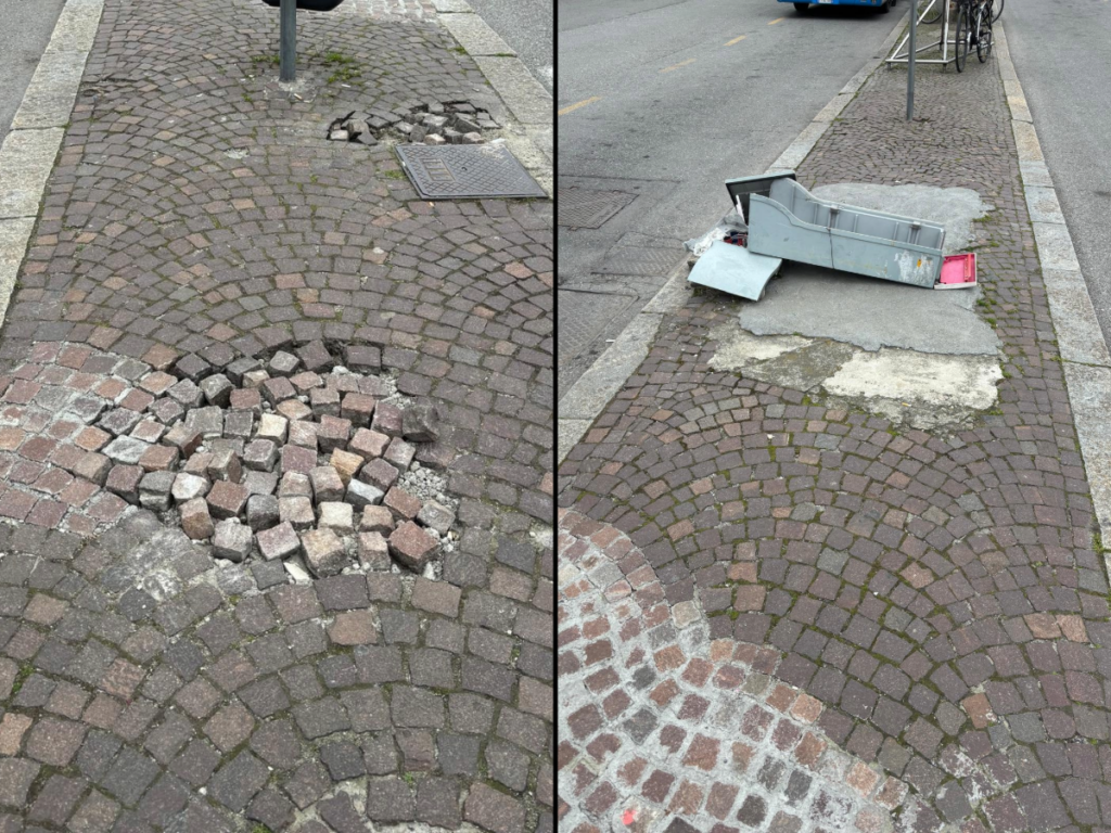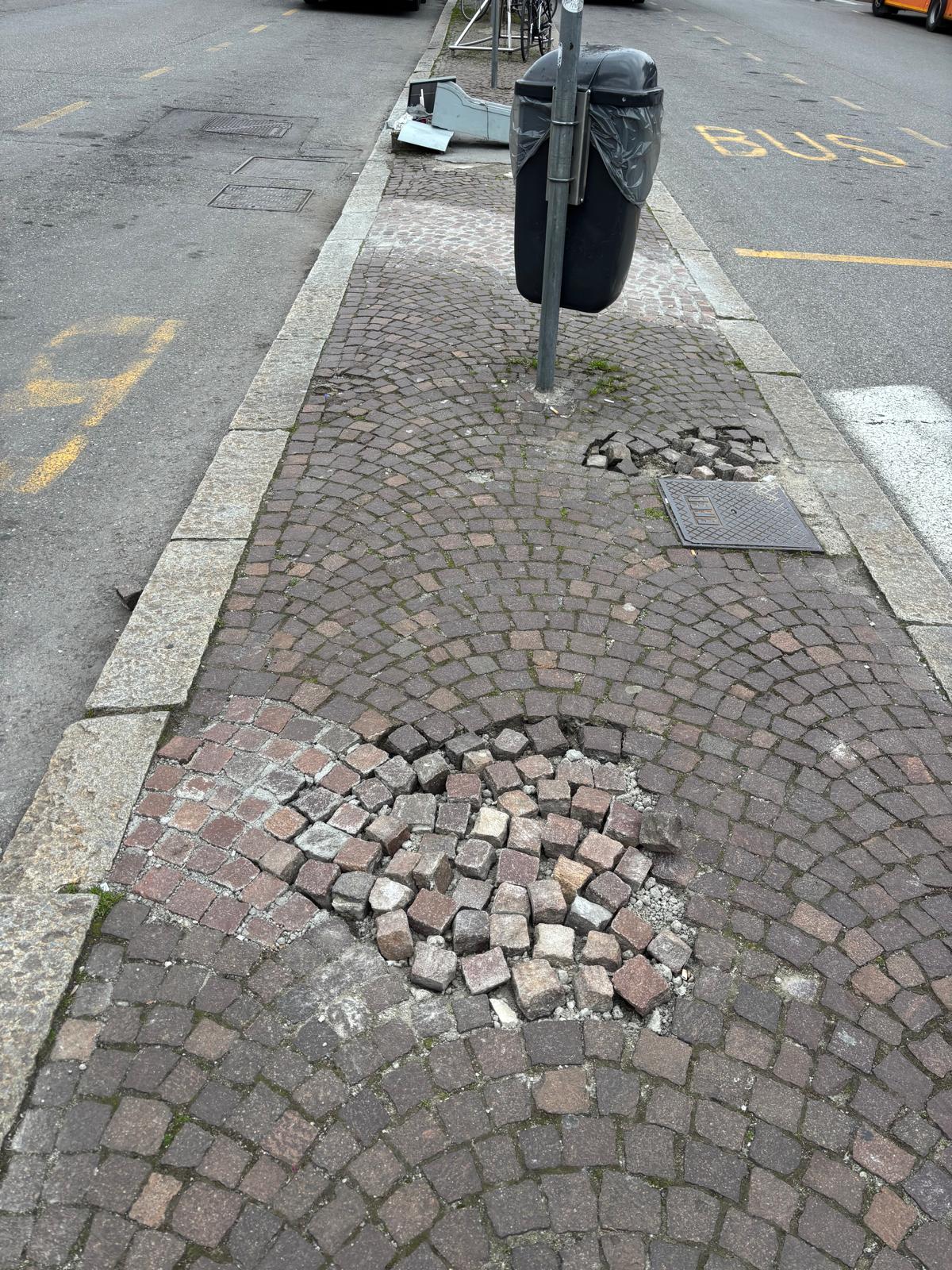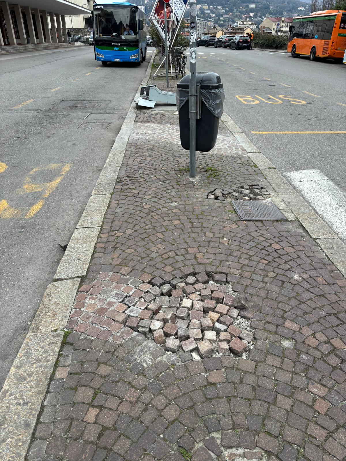 Riceviamo e pubblichiamo la segnalazione di un lettore dalla Stazione di Como San Giovanni. Le immagini che invia sono chiare: centralina (assai probabilmente elettrica) distrutta a terra e porfido oggettivamente pericoloso nell’isola pedonale centrale di piazzale San Gottardo. Indipendentemente dalla brutta immagine che accoglie i turisti in arrivo si pone un problema di sicurezza. Ci scrive: