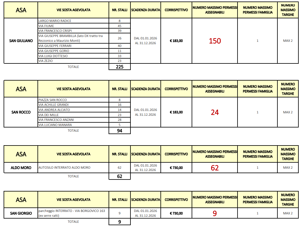 – numero di permessi di sosta agevolata per nucleo residenziale;