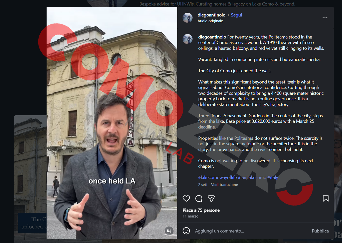 “Quella promozione” appunto faceva riferimento ai due video pubblicati appunto su Instagram dal marito dell’assessore Maccabeo, agente immobiliare. Il primo, dedicato al Politeama, dopo la pubblicazione del nostro articolo è scomparso. Avevamo però catturato un’immagine, questa: