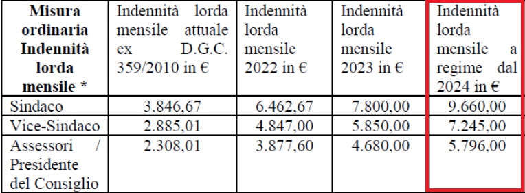 Qui sotto la tabella con le cifre (sempre lorde) mensili, da cui poi si calcola il monte complessivo: al sindaco vanno 9.660 euro al mese, alla vice Nicoletta Roperto 7.245 e agli altri assessori 5.796.
