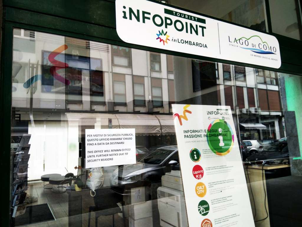 Bastano due passi per trovare strade semi deserte, parchi con pochi avventori, bar e negozi le cui vetrine ospitano i cartelli con riportate le nuove disposizioni per arginare il contagio da Covid-19. Alcuni enti chiusi al pubblico “fino a data de destinarsi”, come l’Info Point Lake Como (che già in tempi buoni non è che sia proprio preso d’assalto).
