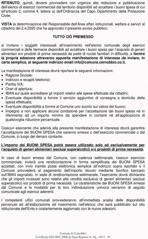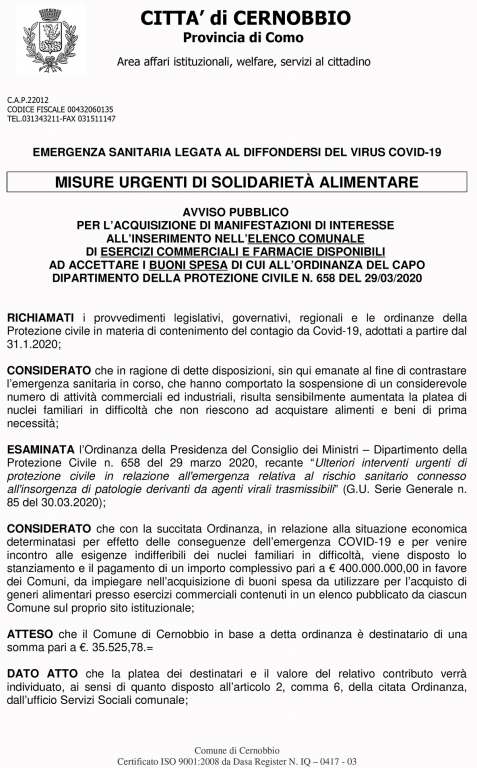 SCARICA QUI L’AVVISO PUBBLICO SUI BUONI SPESA A CERNOBBIO